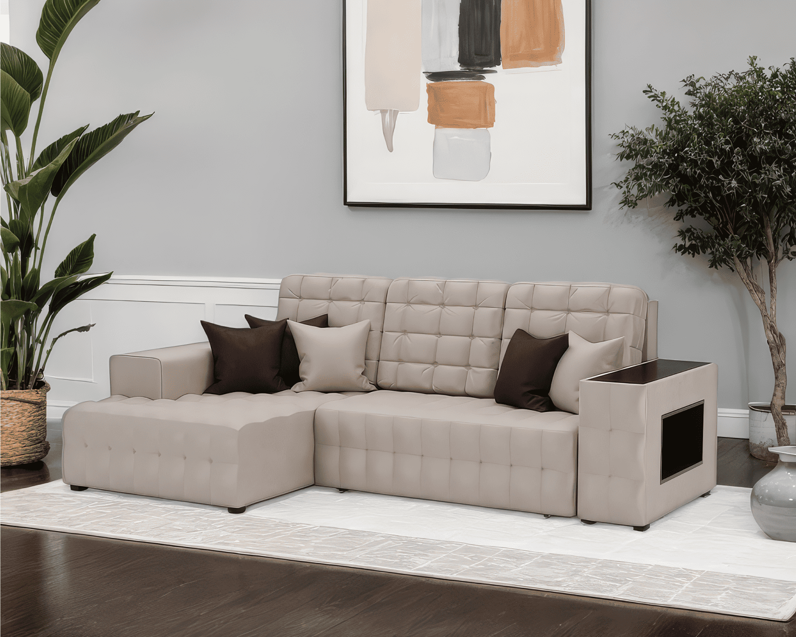 Удобство использования дивана «Мадрид» дополняется ящиком для хранения, который расположен внутри угловой части. В него можно положить небольшие вещи или постельные принадлежности, сохраняя порядок и экономя пространство.