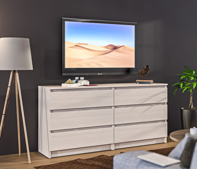 Комод с ящиками выполнен из ЛДСП: прочного и долговечного материала, который устойчив к механическим повреждениям. Мебель дополнена шестью вместительными ящиками, надежными механизмами открывания, а отсутствующие ручки делают модель более органичной и лаконичной.