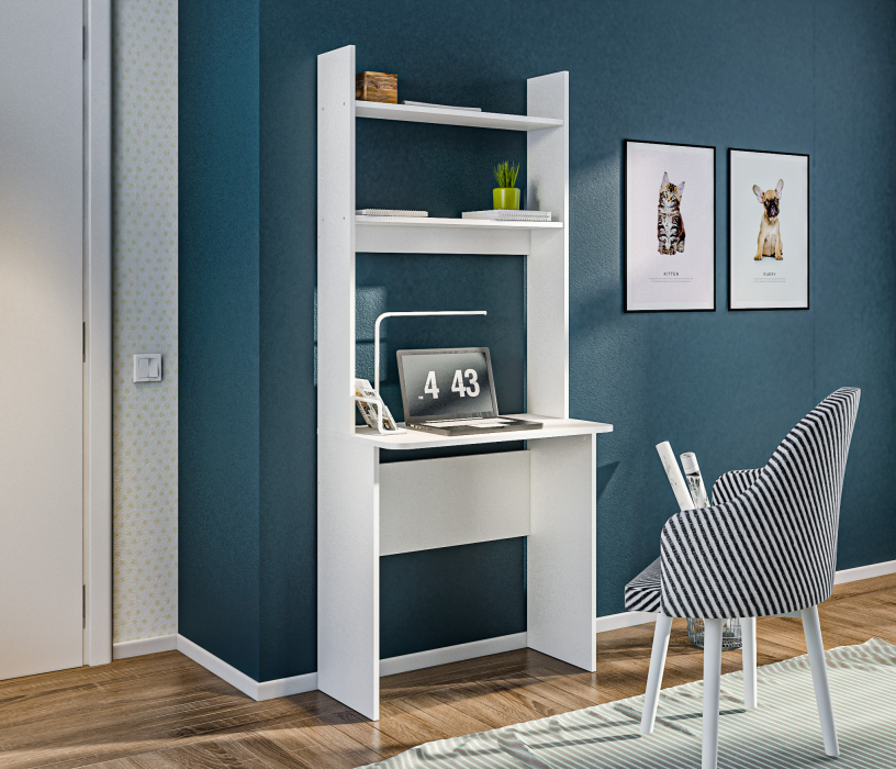 Этот стеллаж со столом обеспечивает удобное рабочее место с дополнительными полками для хранения книг и других предметов.