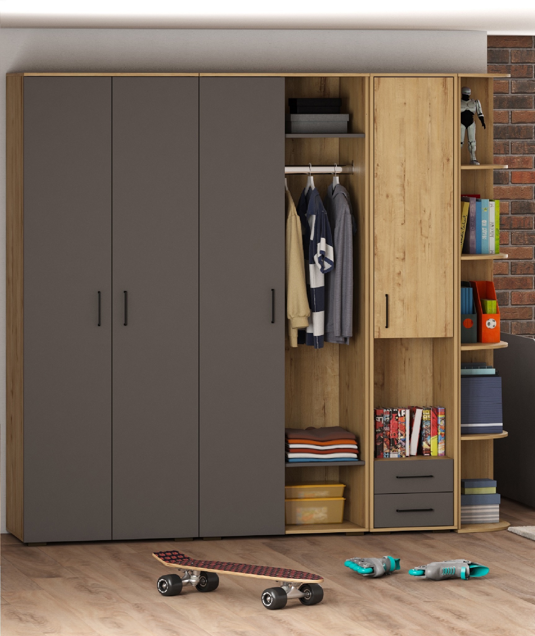 Угловой открытый стеллаж Бруно имеет 4 полки, может использоваться как дополнение к шкафу.