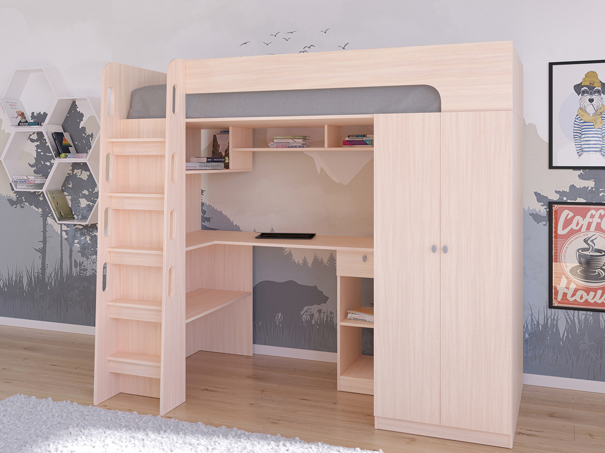 Кровать-чердак Астра 10 порадует Вас практичностью и удобством. Множество полочек позволят без труда разместить книги, поделки, тетради и прочие предметы творчества и учебы. Удобная угловая столешница не даст устать при выполнении домашнего задания или творческой работы. Продуманная конструкция ступеней лестницы позволит безопасно забраться на спальное место. А вместительный шкаф спрячет в своих недрах одежду ребенка.