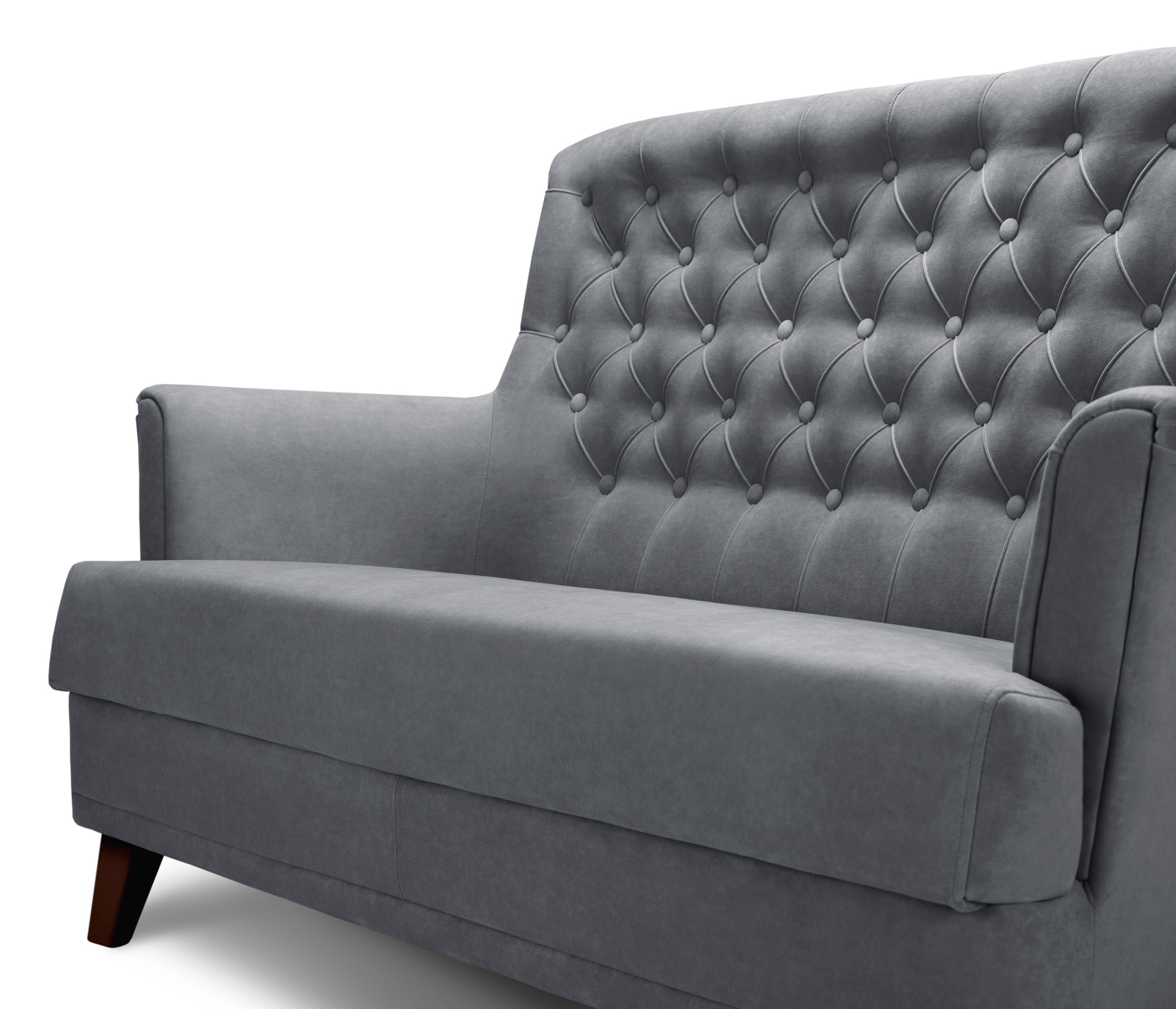 Отделка спинки выполнена с декоративной прострочкой и украшена пуговицами.Ножки дивана выполнены из массива березы для наибольшей устойчивости.