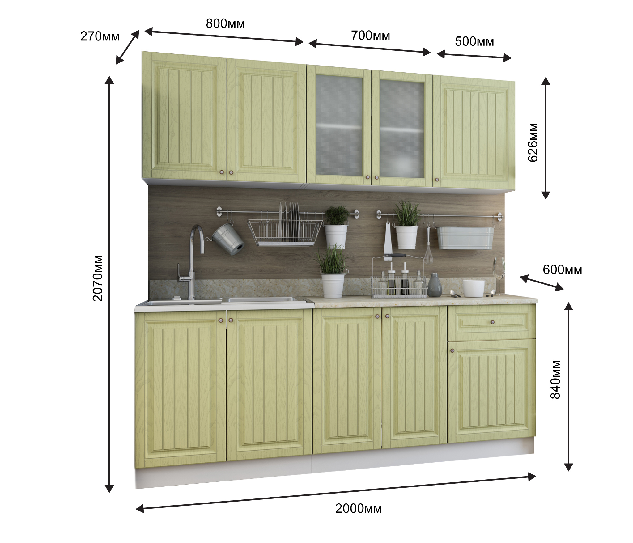 два верхних шкафа - общая ширина 1200мм (500мм , 700мм со стеклом) и на 800мм. Высота 626мм. Глубина 270 мм.