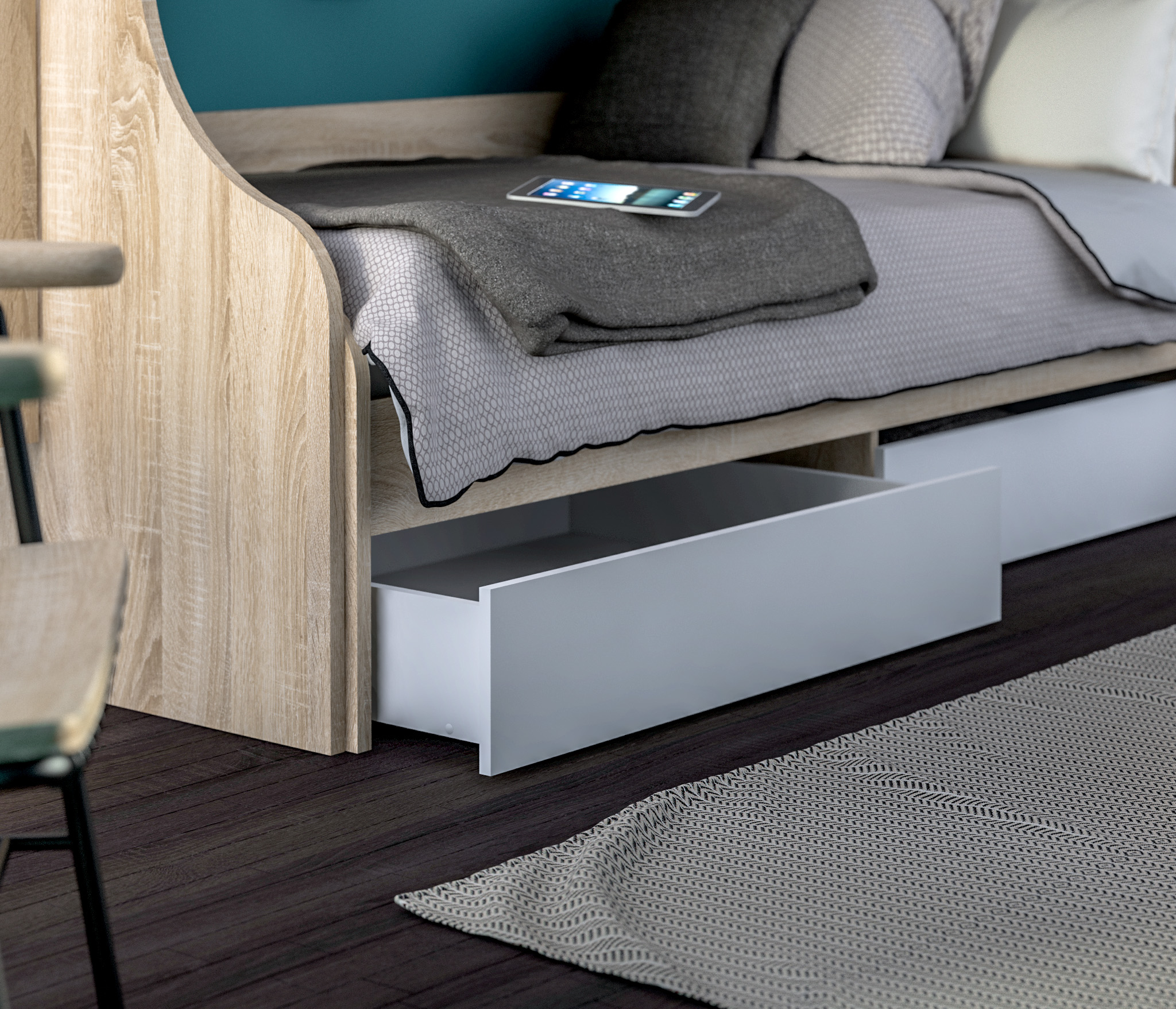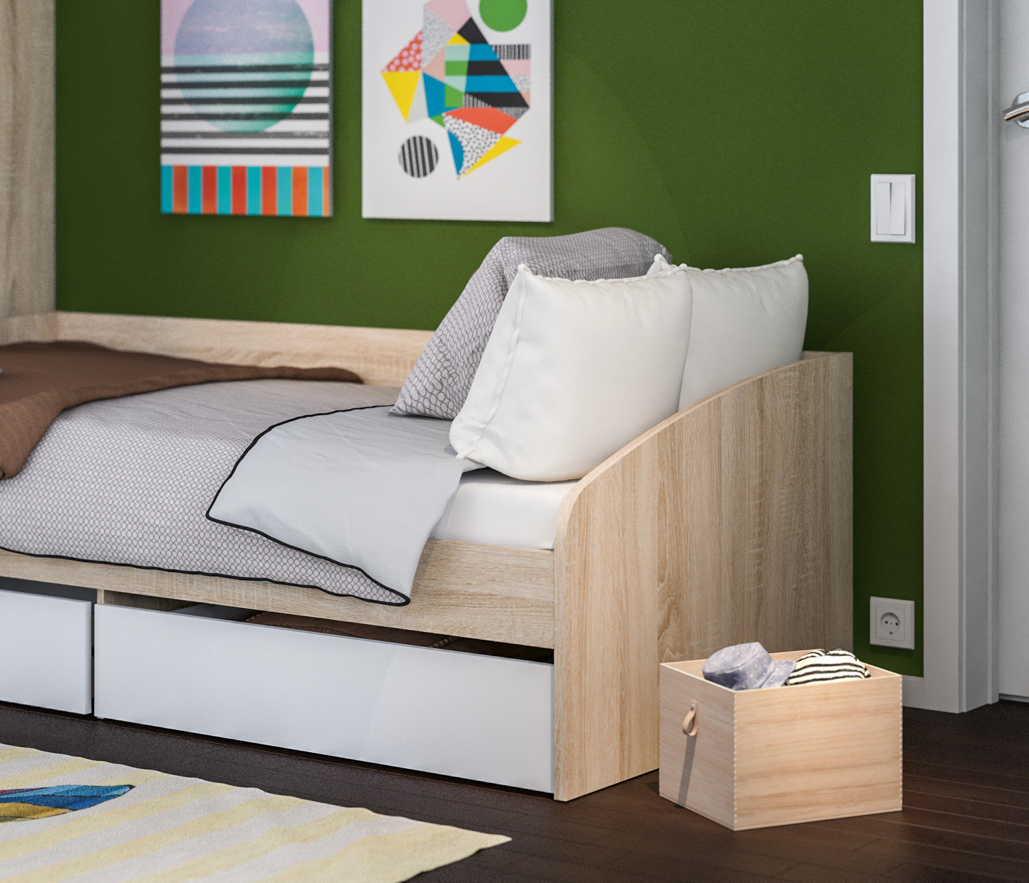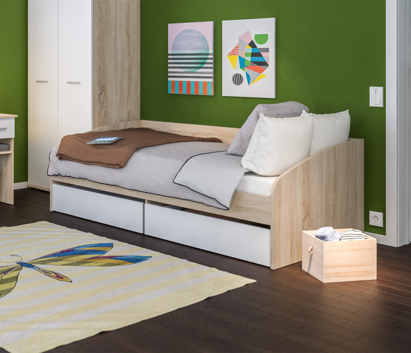 Кровать из детского гарнитура «Мамбо» – симпатичная и комфортабельная модель, воспользоваться которой могут даже взрослые члены семьи. Занимая не так уж и много места, она выделяется своей функциональной значимостью. Три в одном. Днем это вполне приличный диванчик, ночью полноценное спальное место шириной 95 см, к тому же, это и система хранения постельных принадлежностей, так как модель оборудована двумя объемными выдвигающимися ящиками. Кровать собрана из мебельных щитов повышенной прочности с износостойким поверхностным покрытием приятного пастельного оттенка «Дуб Сонома». Ящики и фасады к ним изготовлены из ДСП песочного цвета. Неброское сочетание цветов вносит в интерьер гармонию и умиротворение, что бывает нелишним, когда требуется успокоить разыгравшегося ребенка.