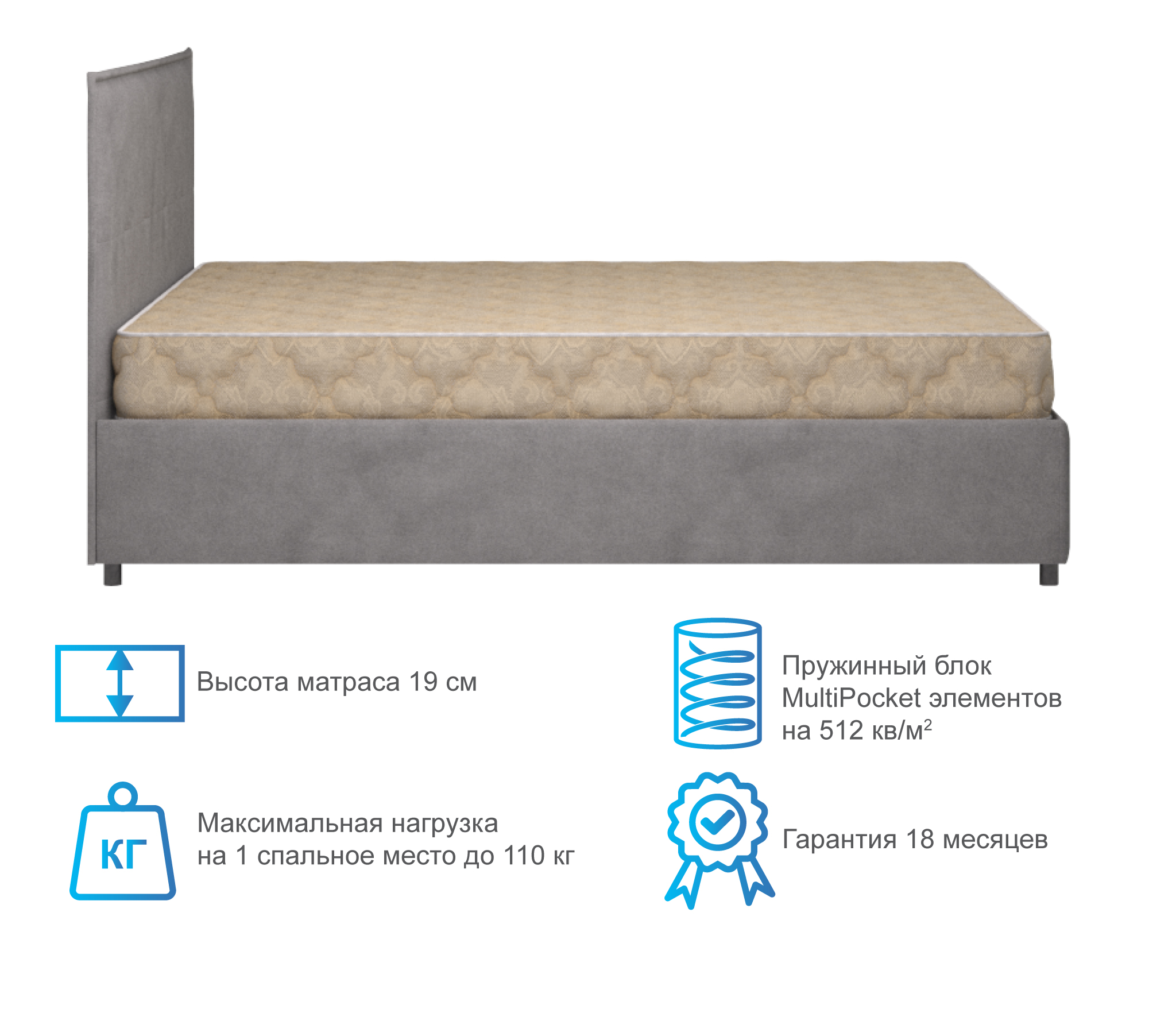 В основе данной модели - блок независимых пружин - TFK (250 пружин на кв.м.), где каждая пружина заключена в отдельный чехол из спанбонда. Внешние слои наполнителей матраса отделены защитным слоем термовойлока, который защищает материал от губительного воздействия, связанного с работой пружинного блока. Такая конструкция предотвращает появление эффекта гамака, а также способна справится с разницей в весе спящих - более 25 кг.