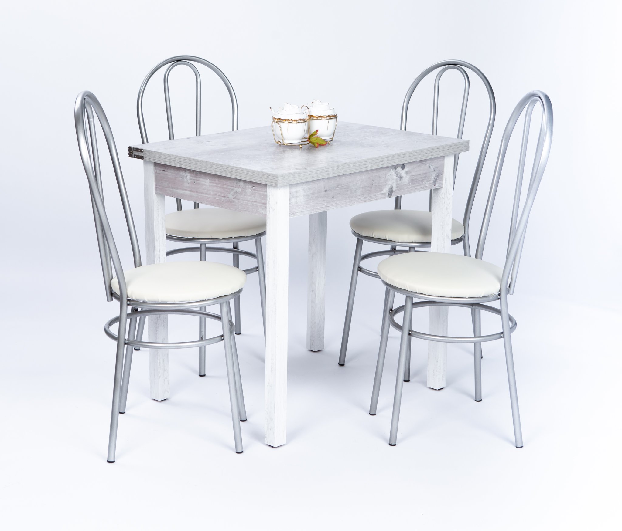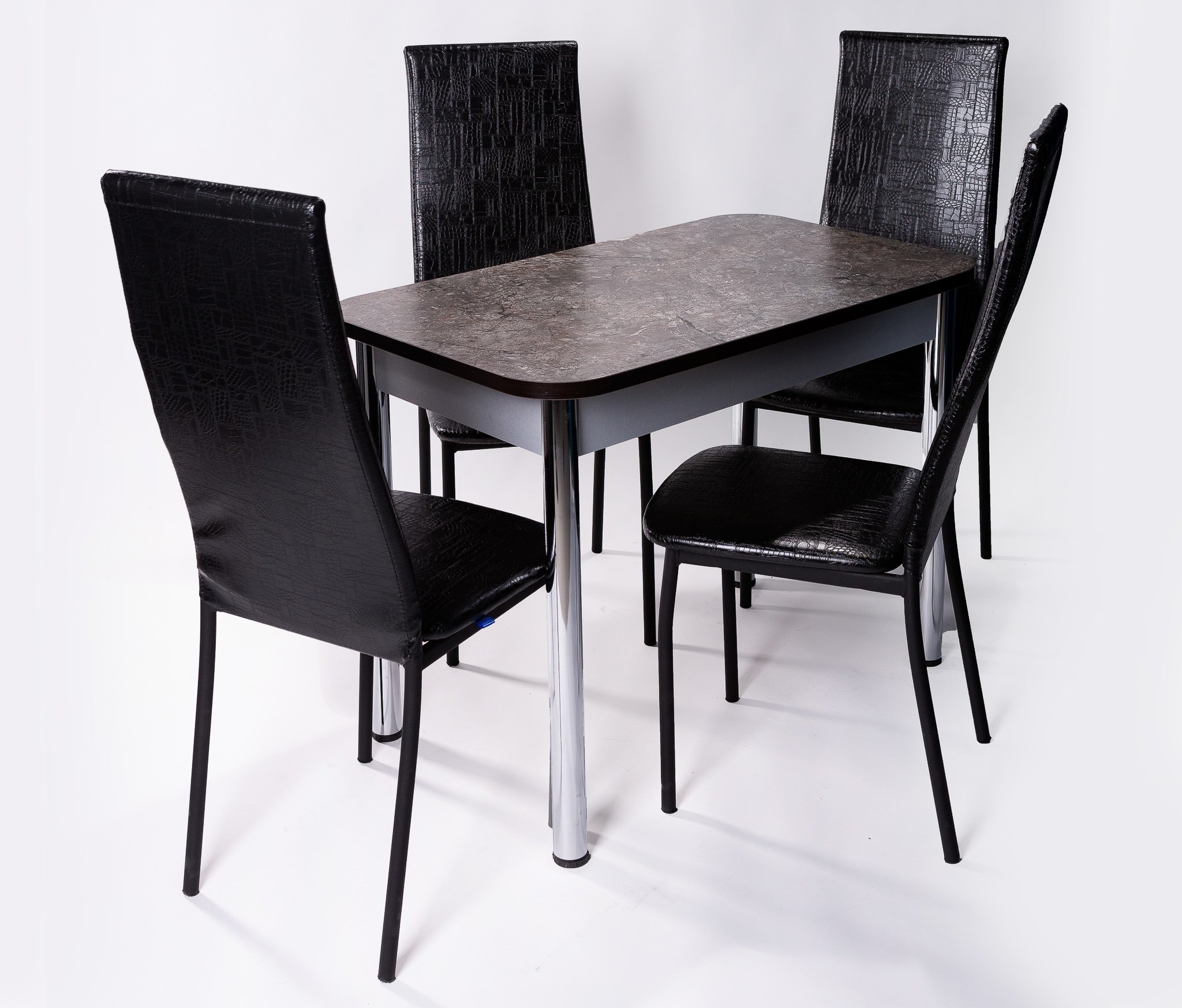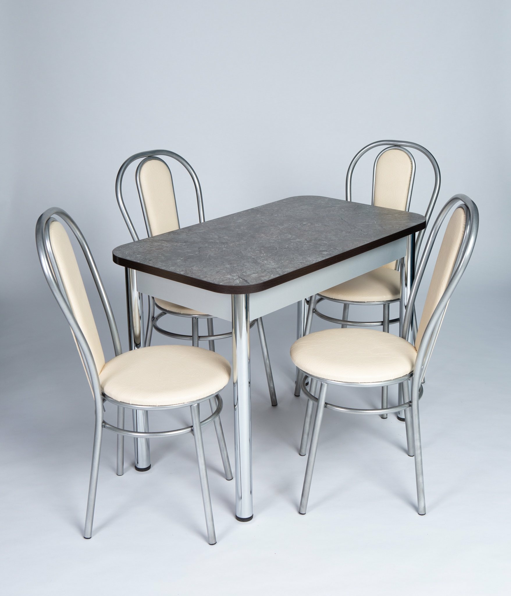 Обеденная группа 80 состоит из стола раскладного в сложенном виде 60*80,в разложенном 80*120см..Ножки Хромированные труба d-50 регулируемая .В комплекте 4 Стула на металлокаркасе,сидение и спинка мягкие(наполнение поролон,обивка экокожа).Ножки Хром серый.