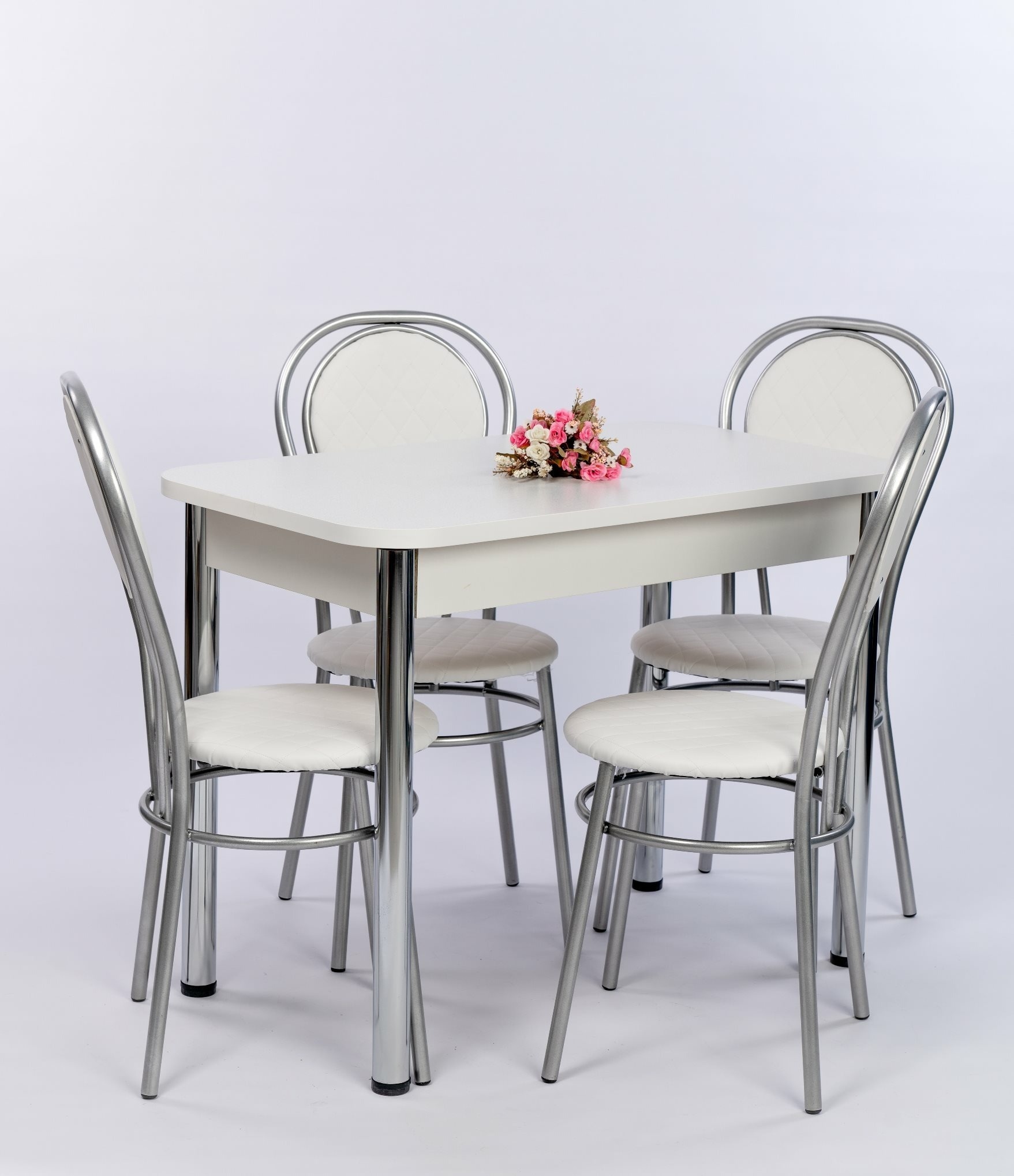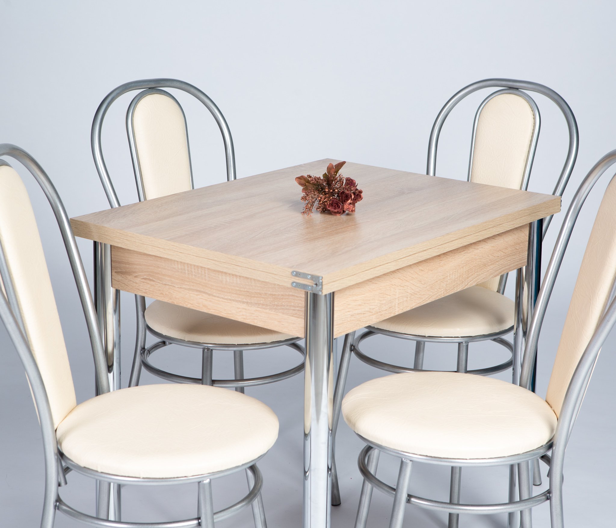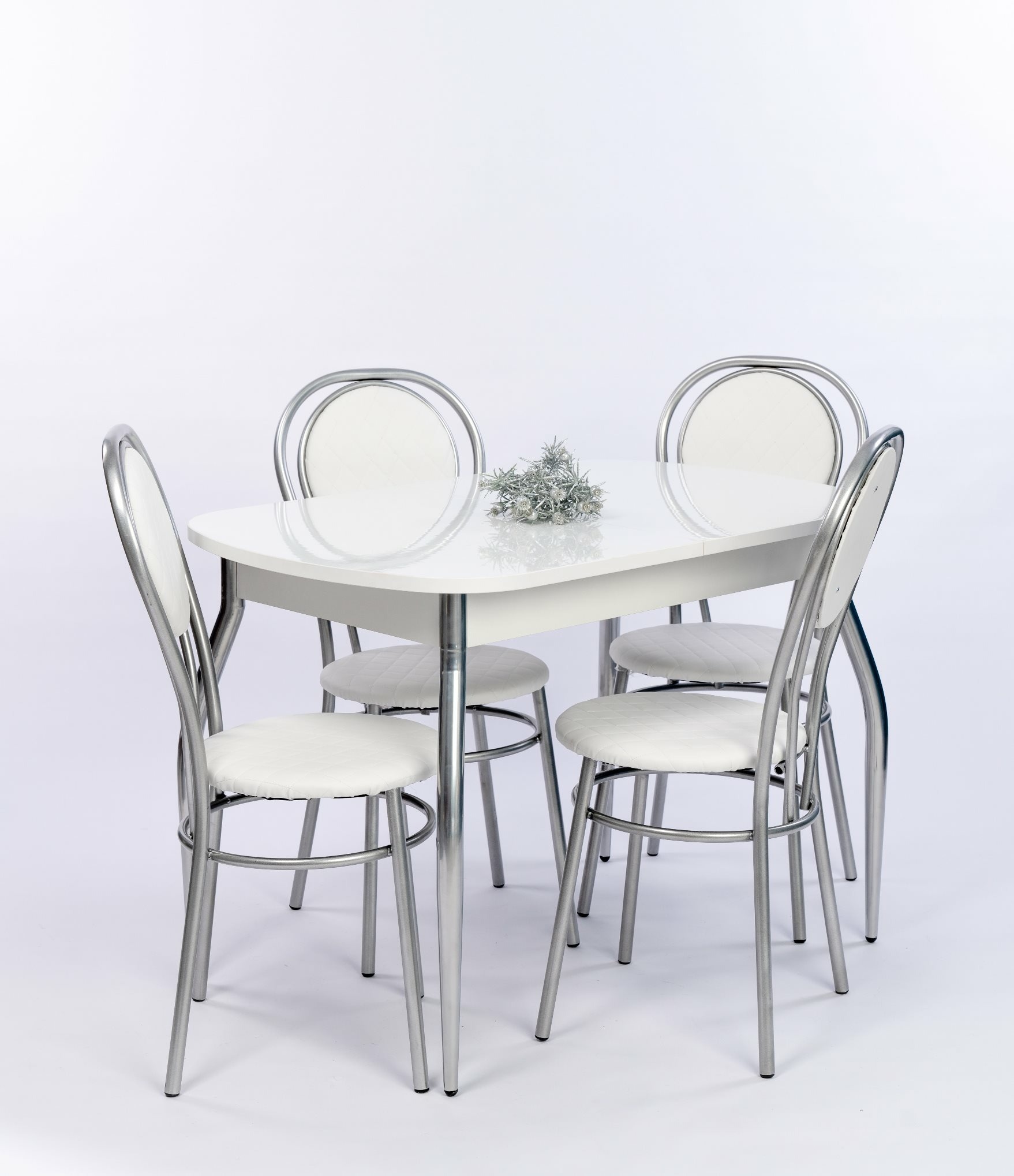 Обеденная группа 80 состоит из стола раскладного в сложенном виде 60*80,в разложенном 80*120см..Ножки Хромированные труба d-50 регулируемая .В комплекте 4 Стула на металлокаркасе,сидение и спинка мягкие(наполнение поролон,обивка экокожа).Ножки Хром серый.