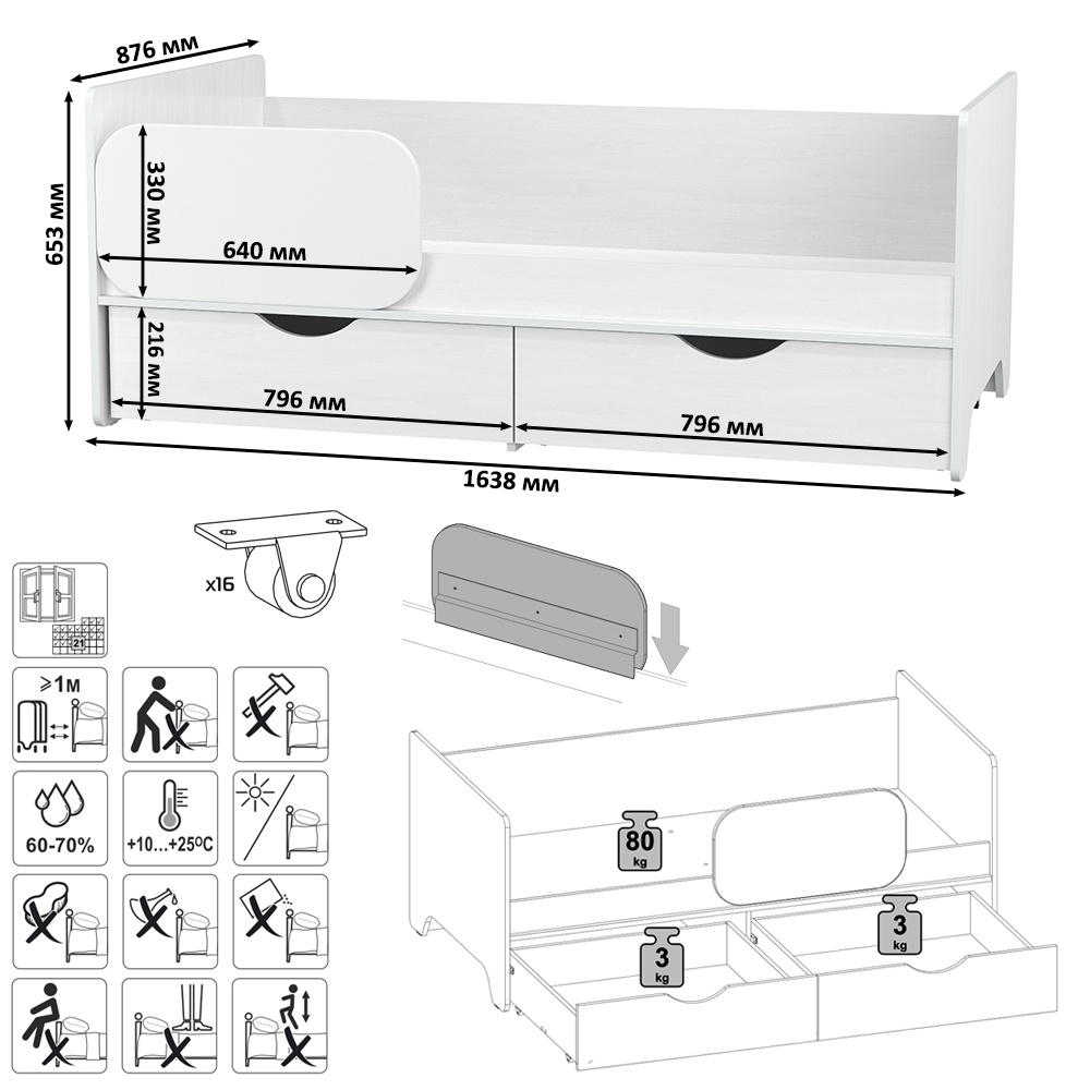 Спальное место: 800х1600 мм. Основание под матрас в комплекте, матрас для этой кровати приобретается отдельно.
