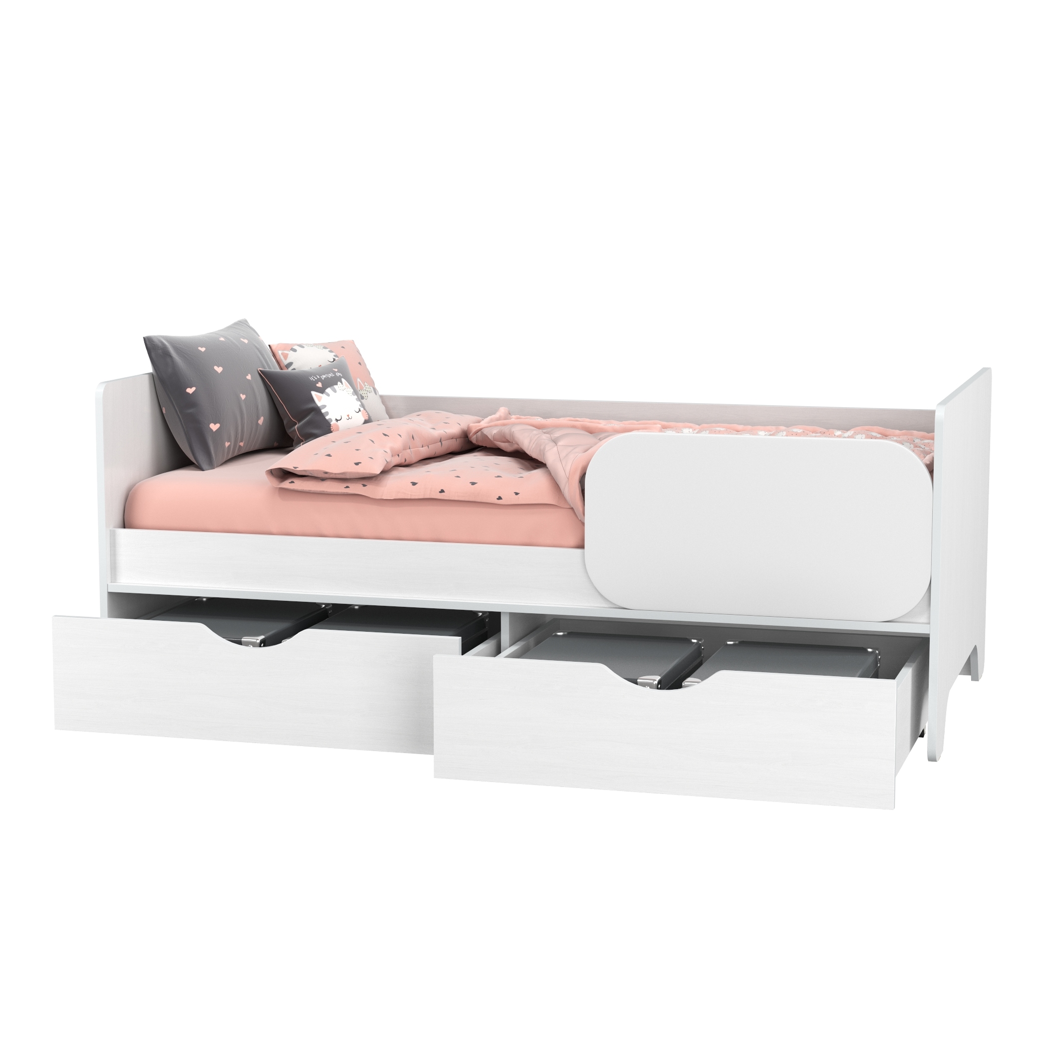 Трогательная прелесть белого цвета кровати с ящиками Уна 11.22 добавит эстетику чистоты и невинности в интерьерный дизайн детской. Все краевые элементы кровати выполнены с травмобезоопасным закруглением, ящики открываются за специальный вырез на фасадах. Выполнена в белом цвете с тиснением, структурой «Поры дерева». Выполнена из высококачественной ламинированной ДСП толщиной 16 мм, торцы окромлены ПХВ плёнкой. Поставляется в разобранном виде.