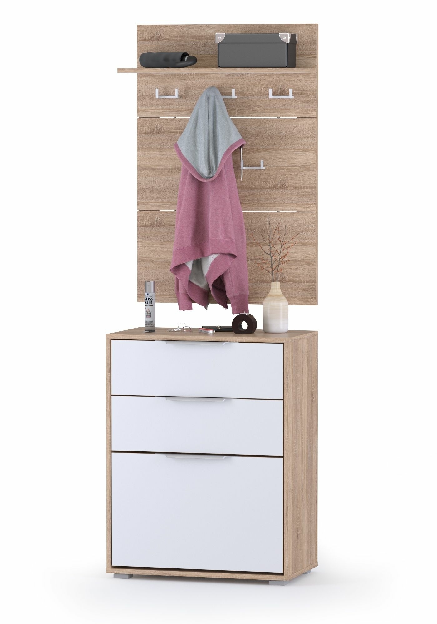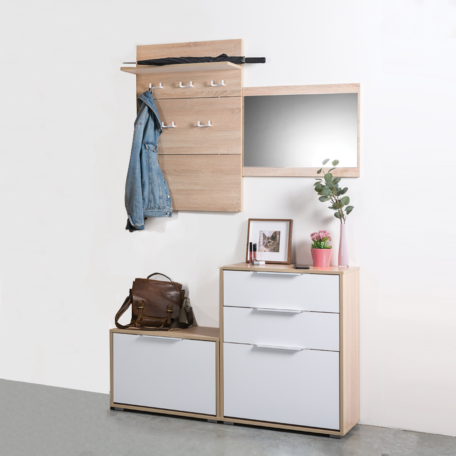 Юнона Прихожая 2 - компактная красивая прихожая для уютного дома. Данная прихожая состоит из тумбы для обуви и открытой вешалки. Тумба имеет выдвижной ящичек для необходимых мелочей и открытую нишу для хранения обуви. При весьма компактных размерах, тумба достаточно устойчива, чтобы служить банкеткой. Открытая вешалка поможет поддержать чистоту в прихожей и обеспечить сохранность Ваших вещей. Вешалка имеет антресольную полочку для головных уборов, которая закреплена на металлическом полкодержателе. Форма полкодержателя выполнена так, что может использоваться в качестве штанги для развешивания одежды на плечиках. Кроме того, на лицевой панели есть пара крючков для размещения сумочек или зонтиков. Юнона Прихожая 2 состоит из элементов набора мебели для прихожих Юнона.