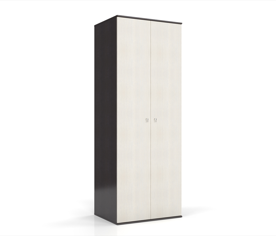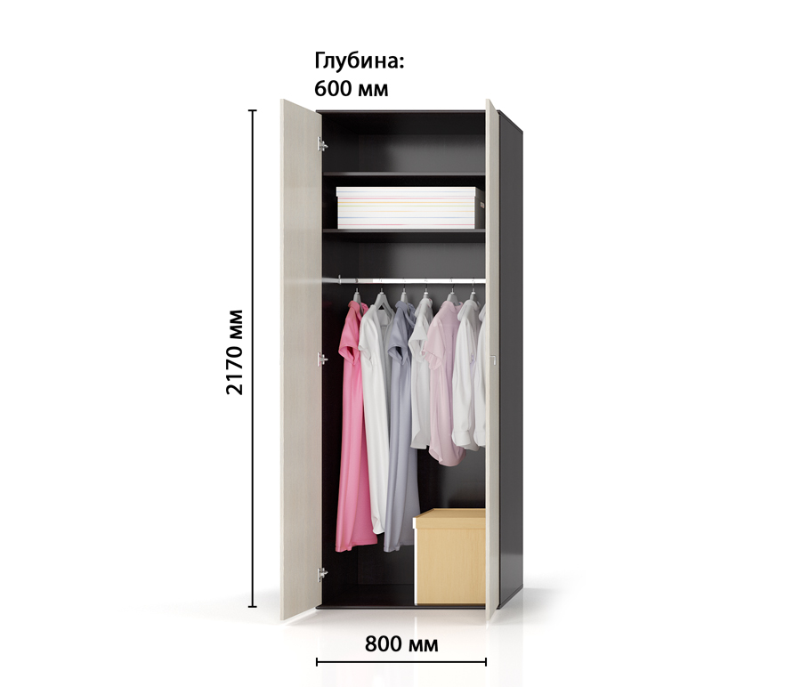 Двухстворчатый шкаф, оснащённый двумя полками и штангой для вешалок. длина 800 высота 2203 глубина 600