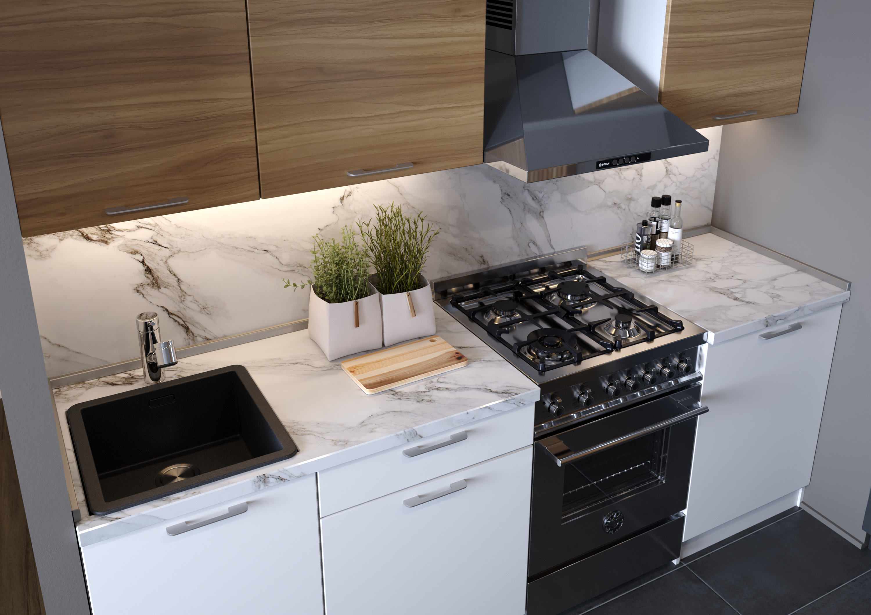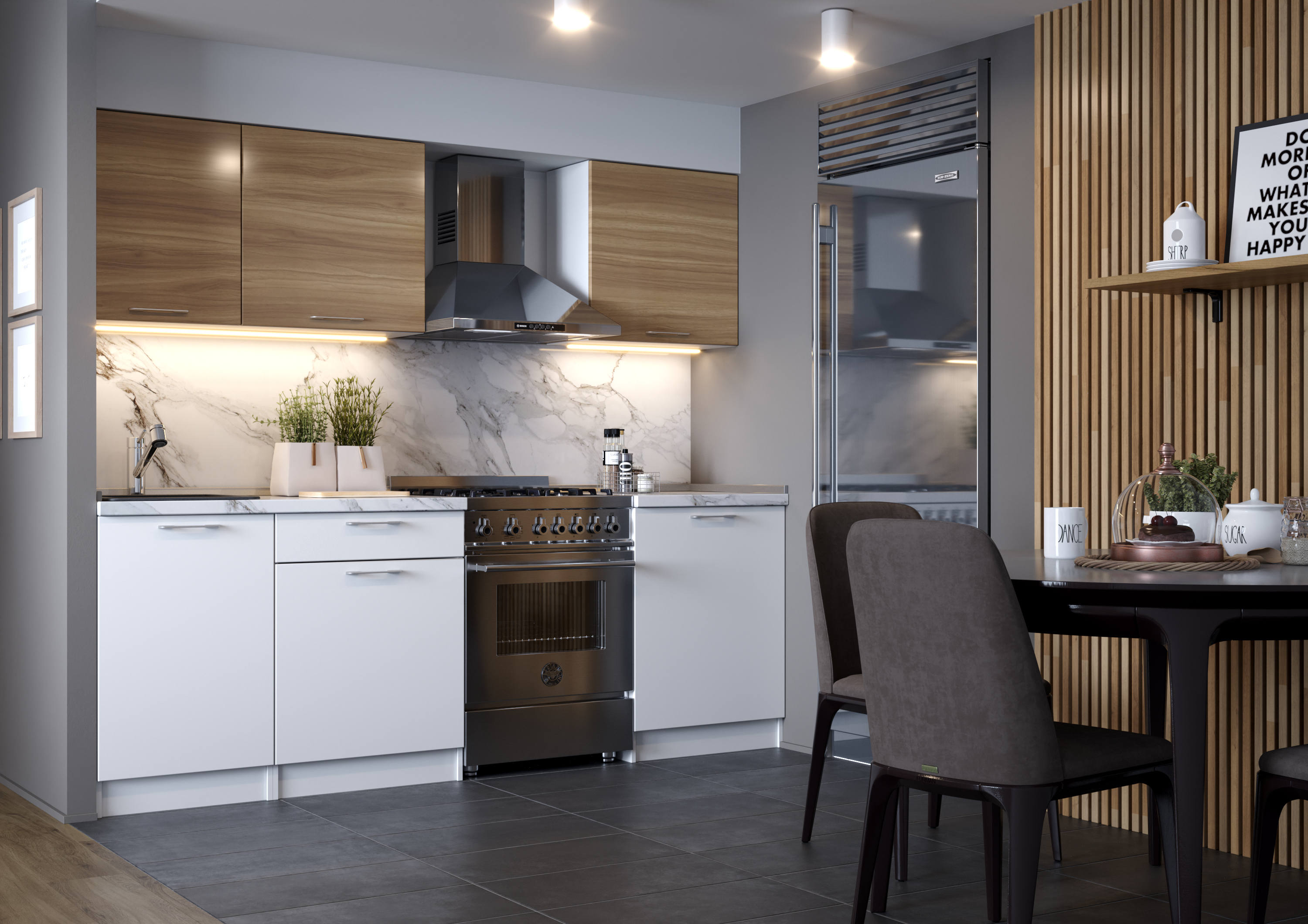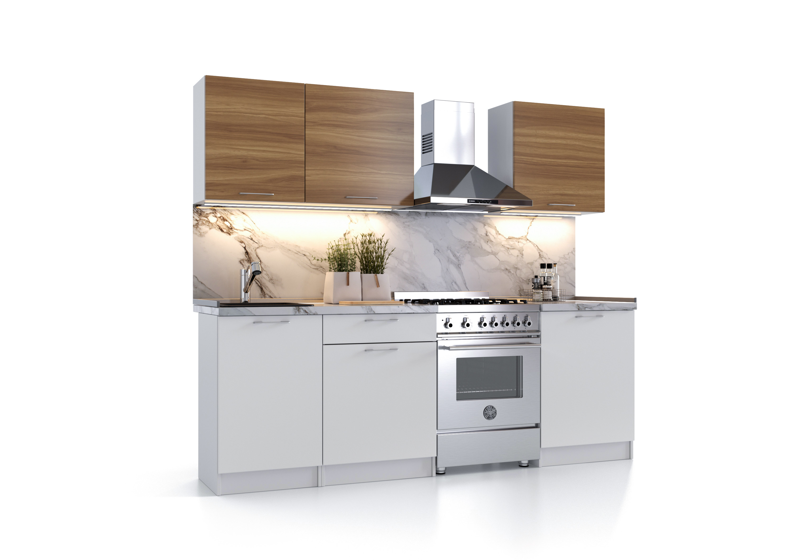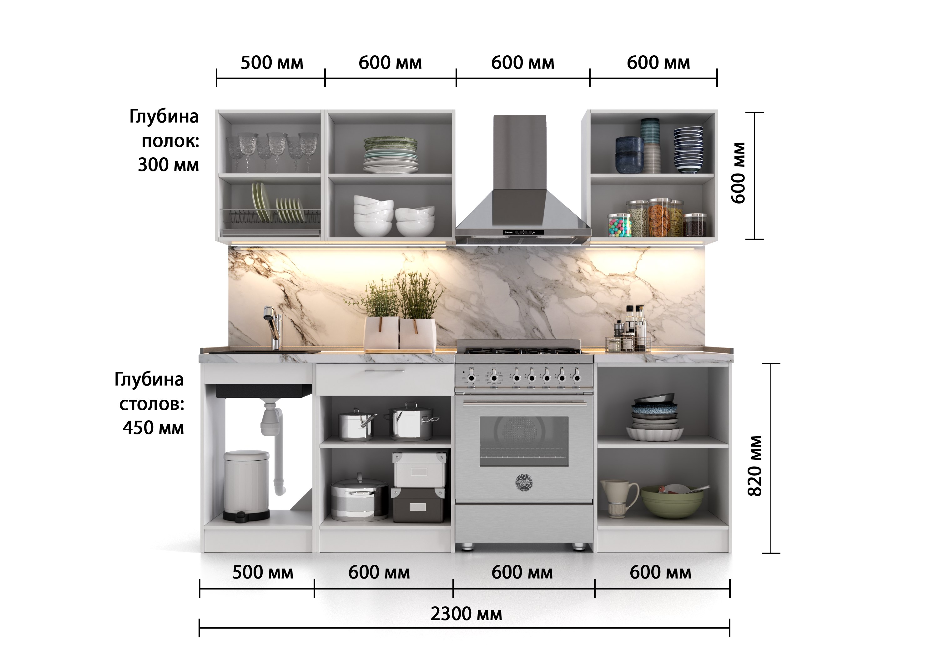 Корпус выполнен из ЛДСП в цвете белый, фасады из МДФ в цвете слива / белый. Длина гарнитура составляет 1700 мм (без плиты). Глубина полок – 300 мм, столов – 450 мм. Мойка и столешница в стоимость гарнитура не входят