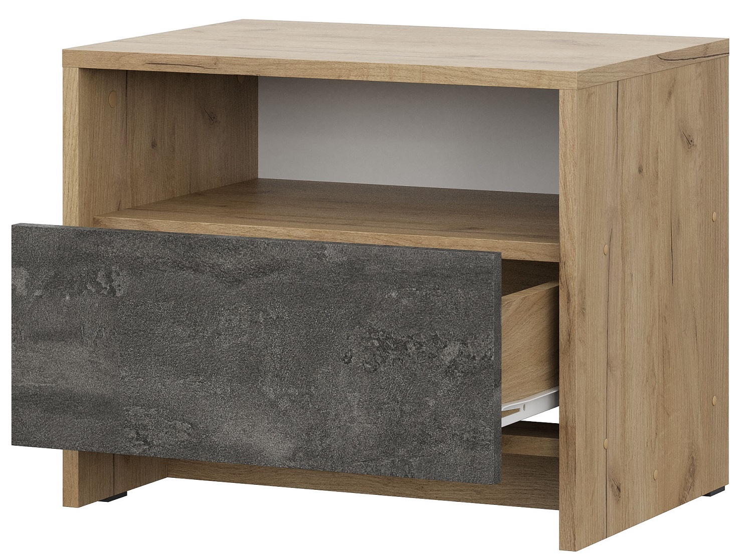Прикроватная тумба Лофт состоит из открытой ниши и отделения с выдвижным ящиком. Несмотря на компактный размер, Вы сможете разместить все вещи, которые должны быть под рукой перед сном и после пробуждения. Отсутствие наружной фурнитуры выглядит стильно, при этом ящик открывается и закрывается легким движением руки.