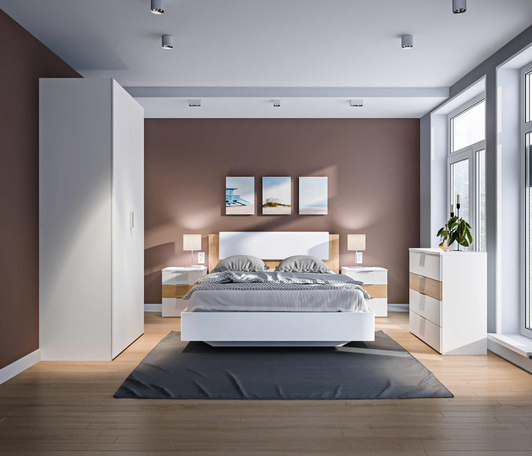 Двуспальная кровать имеет в изголовье мягкую накладку из качественной искусственной кожи.