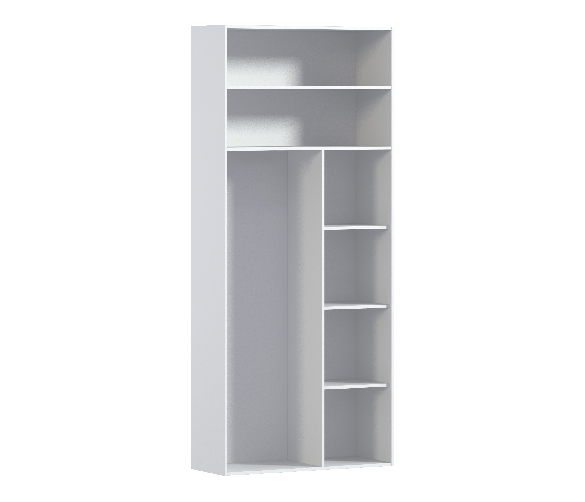 Модульность элементов позволяет самостоятельно создать шкаф с нужными вам параметрами: расположение и количество полок, ящиков, штанг и вариантов дверей зависит только от вашей фантазии.