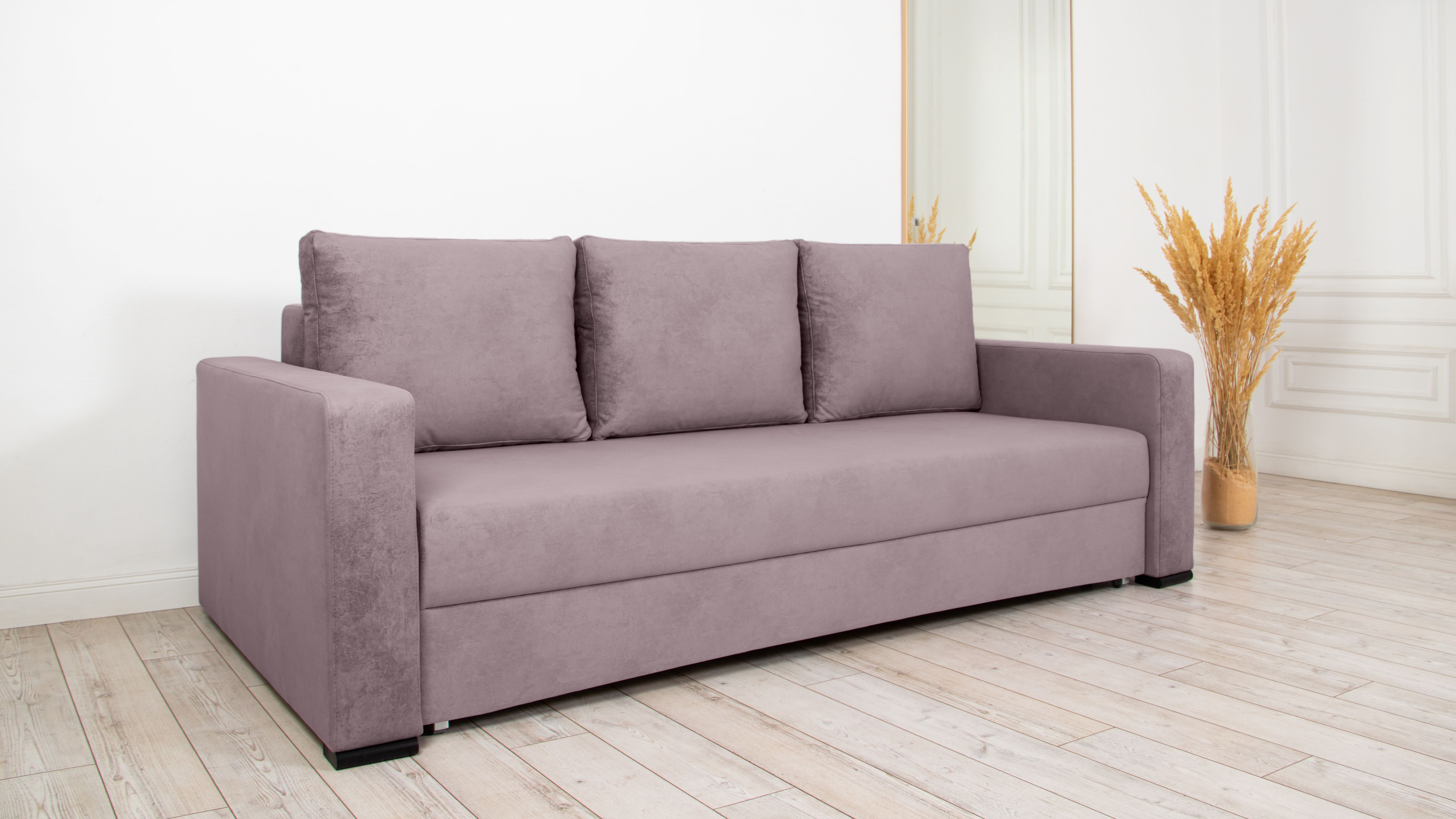: диван с подобным механизмом занимает совсем мало места, может стоять как у стены, так и в середине комнаты