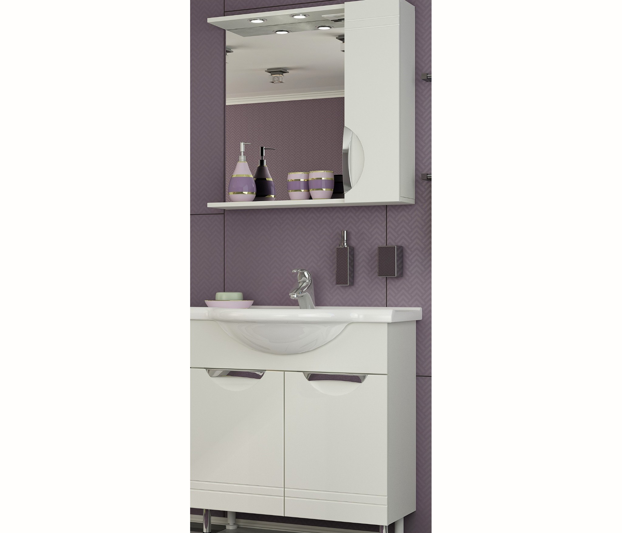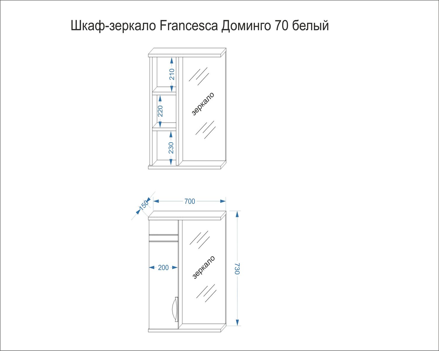 Полезным функциональным элементом в обстановке ванной комнаты станет оформленный в современном стиле шкаф-зеркало Francesca Avanti Доминго 70. В компактной конструкции совмещен оборудованный распашной дверью навесной шкафчик с внутренними полками и удобное зеркало, установленное в окружении карниза со встроенным светильником вверху и открытой полочки для аксессуаров ежедневного использования внизу. Компания «Франческа» поставляет данную модель также в составе комплекта мебели для ванных комнат. Характерной чертой в оформлении является окраска в белый цвет и стильные хромированные ручки.