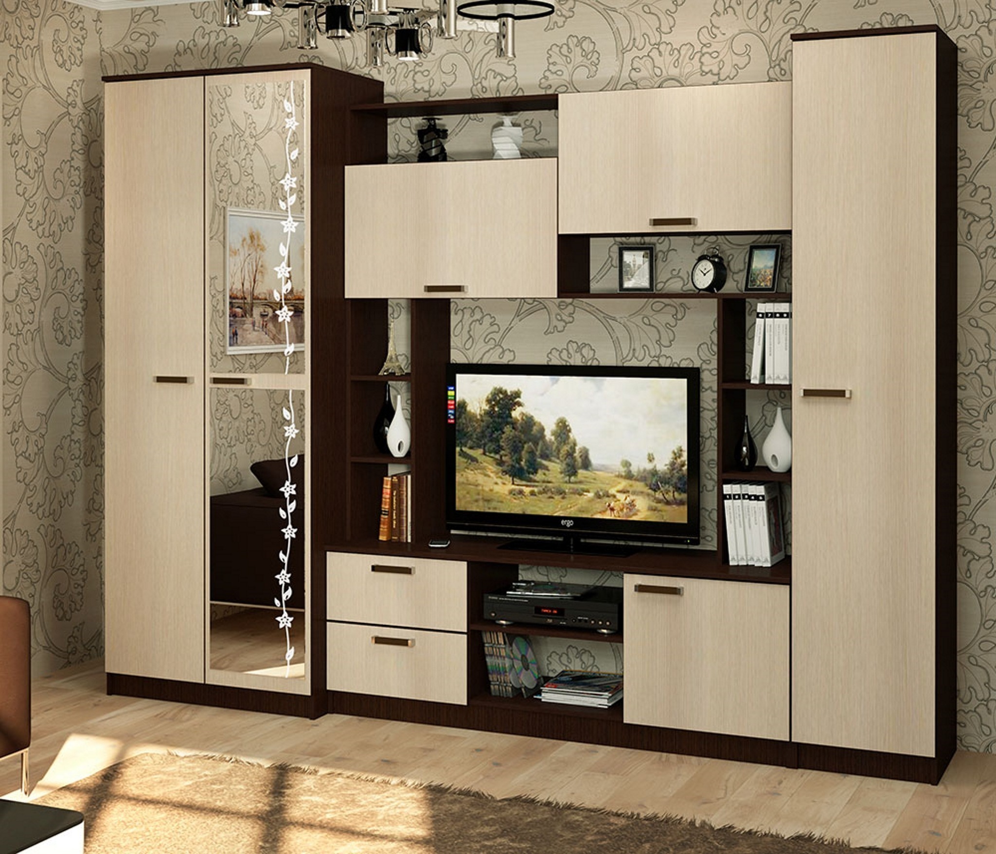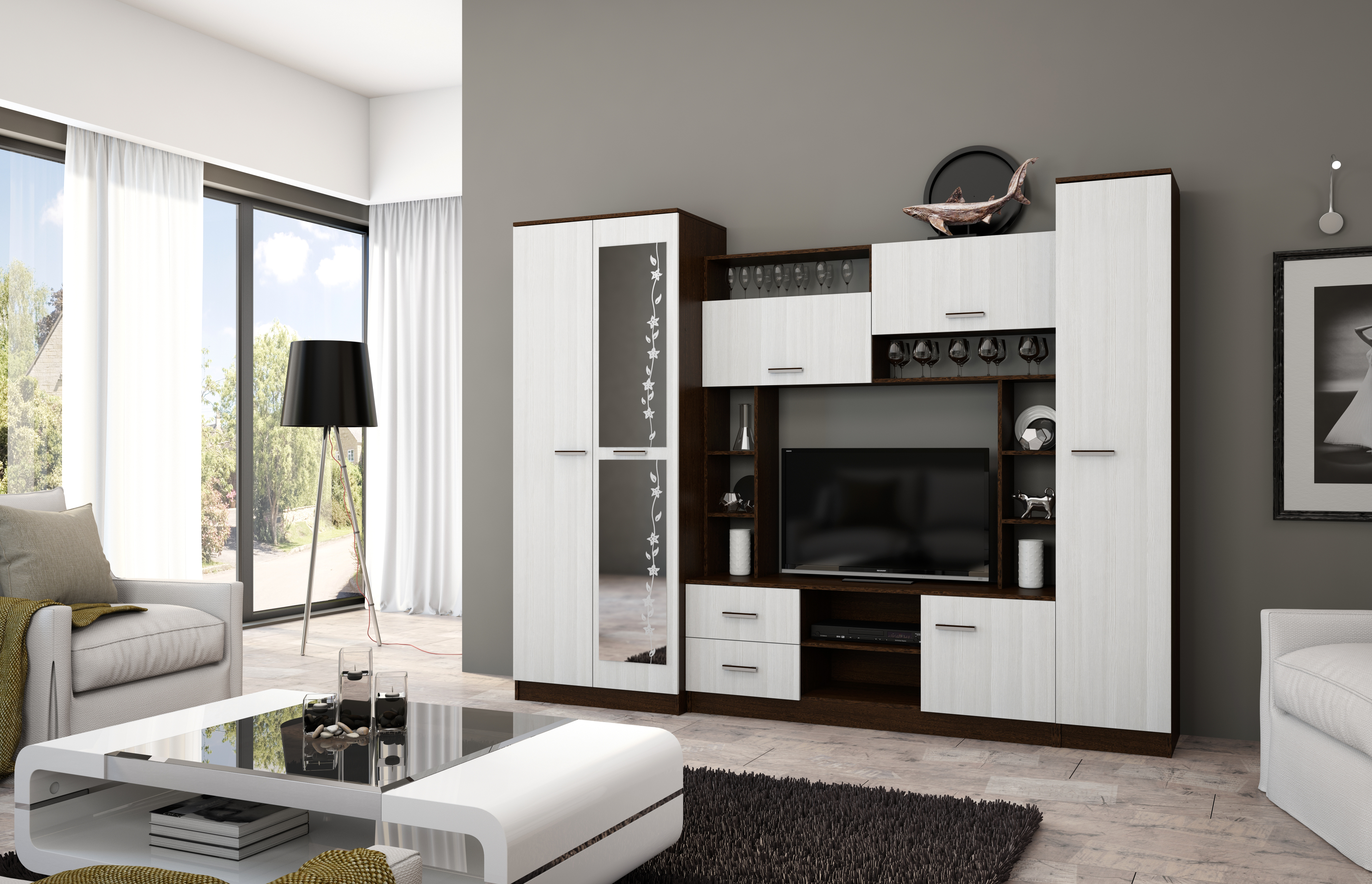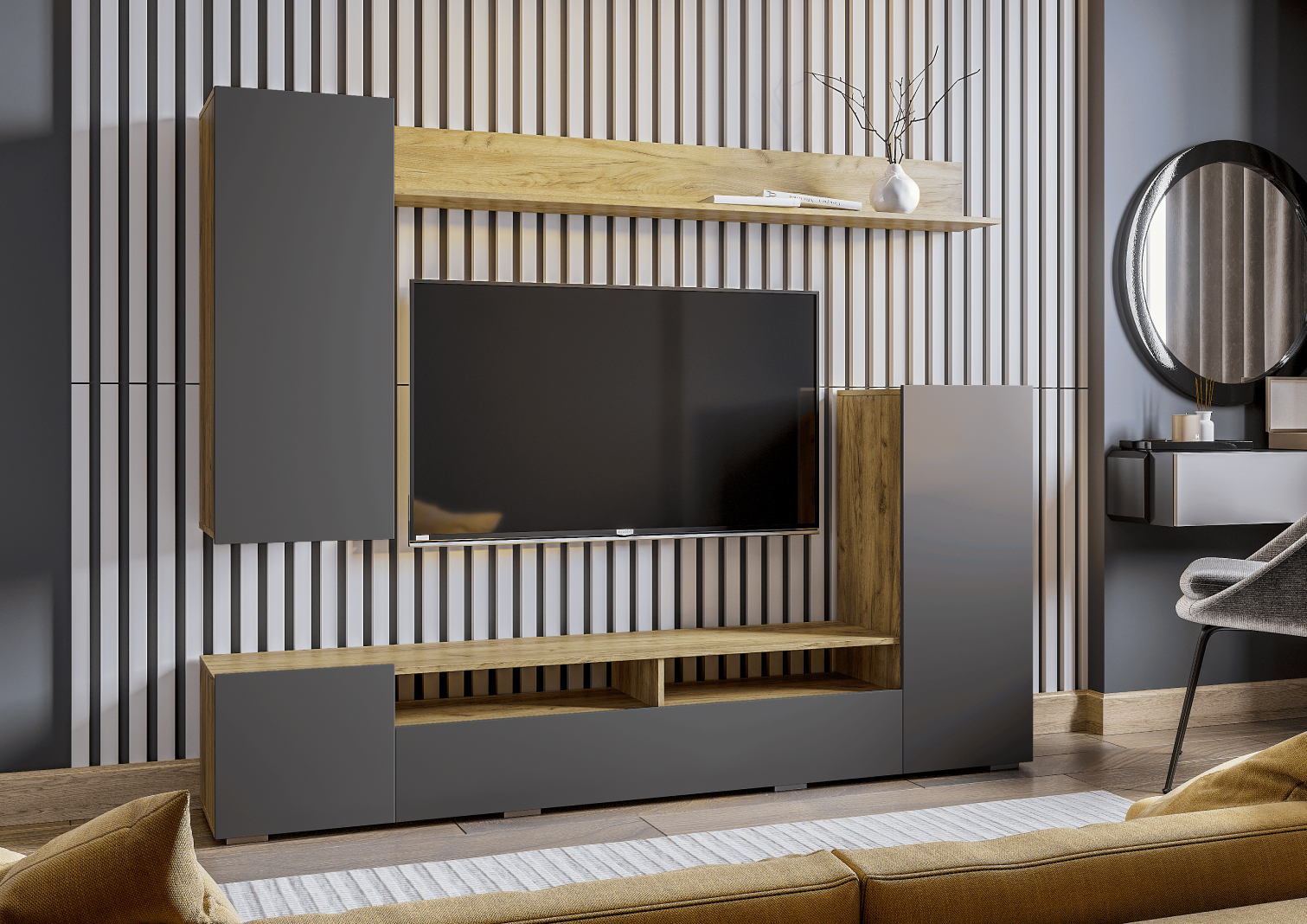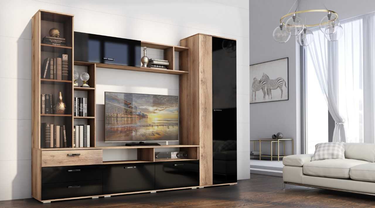 Стенка Милан СБ-3265/1 идеально подходит для тех, кто ценит стиль, удобство и качество. ¶Материал корпуса: ЛДСП цвет Серый Перламутровый, Дуб Гамильтон натуральный