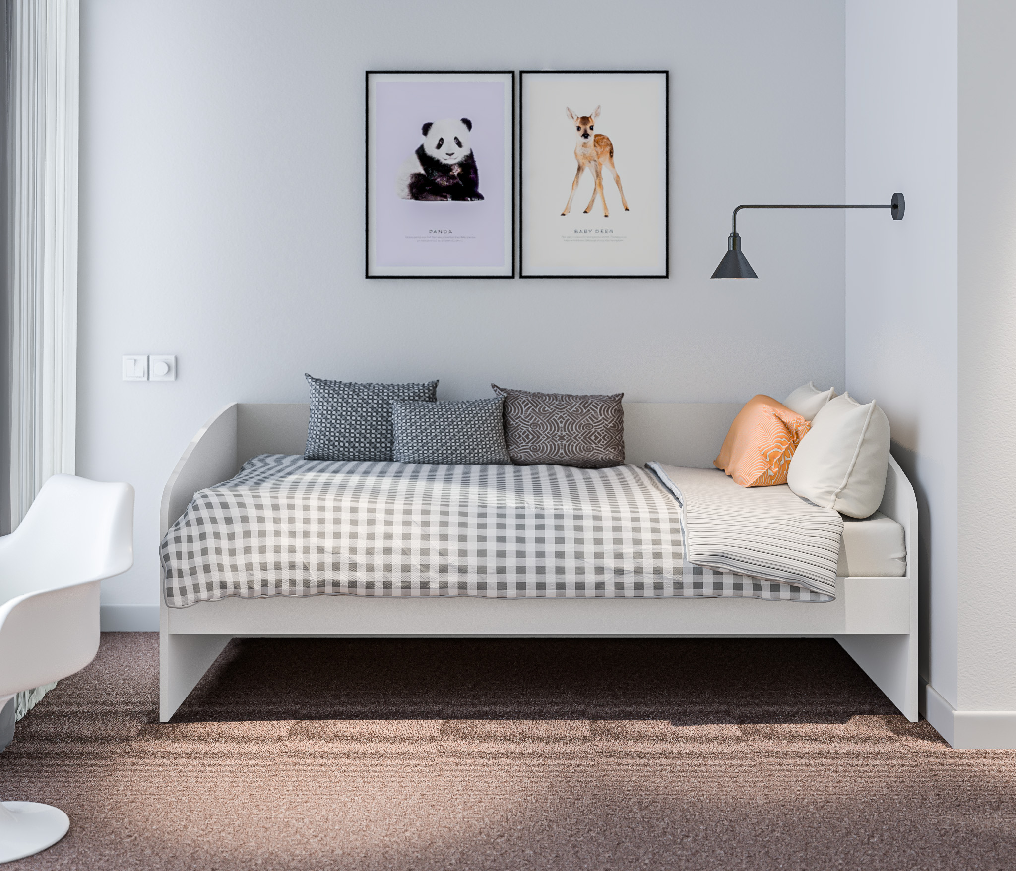 Мы дополнили яркими аксессуарами, типа подушек и другим ярким окружением в интерьере.