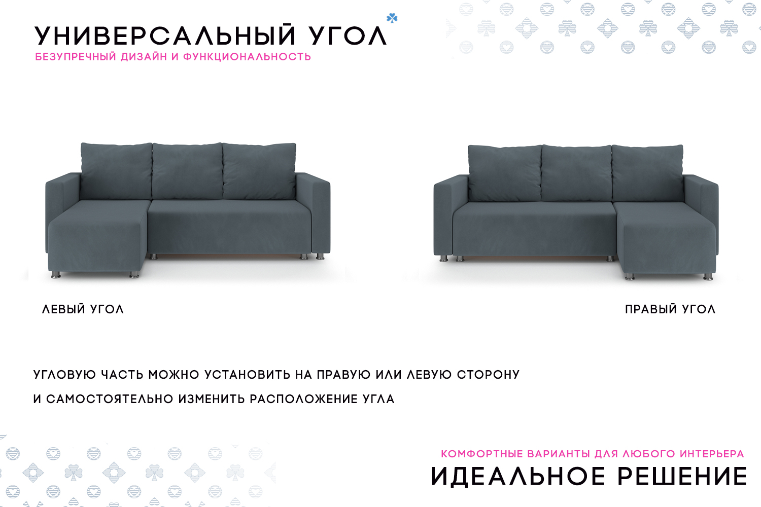 Удобный, стильный, компактный угловой диван. Универсальный угол - большой плюс, раскладывается просто и легко.