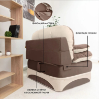 Кресло-кровать изготовлено из износостойкого велюра, который имеет 50 000 циклов по мартиндейлу (по стандарту необходимо 20 000). Наружный чехол матраса легко снимается для чистки. Обивка выполнена из мягкой и приятной на ощупь ткани, которая легко чистится и не выцветает со временем. Это кресло-трансформер легко складывается и раскладывается, что позволяет быстро и удобно изменять его форму в зависимости от ваших потребностей. В сложенном виде оно занимает минимум места, а в разложенном превращается в полноценное спальное место. Это особенно полезно для небольших квартир или домов, где каждый метр пространства имеет значение. Для раскладывания диванчика необходимо сделать несколько простых операций: отодвинуть его от стены, отстегнуть “липучки”-фиксаторы, опустить спинку, расстегнуть “молнии” в средней части основания и разложить.