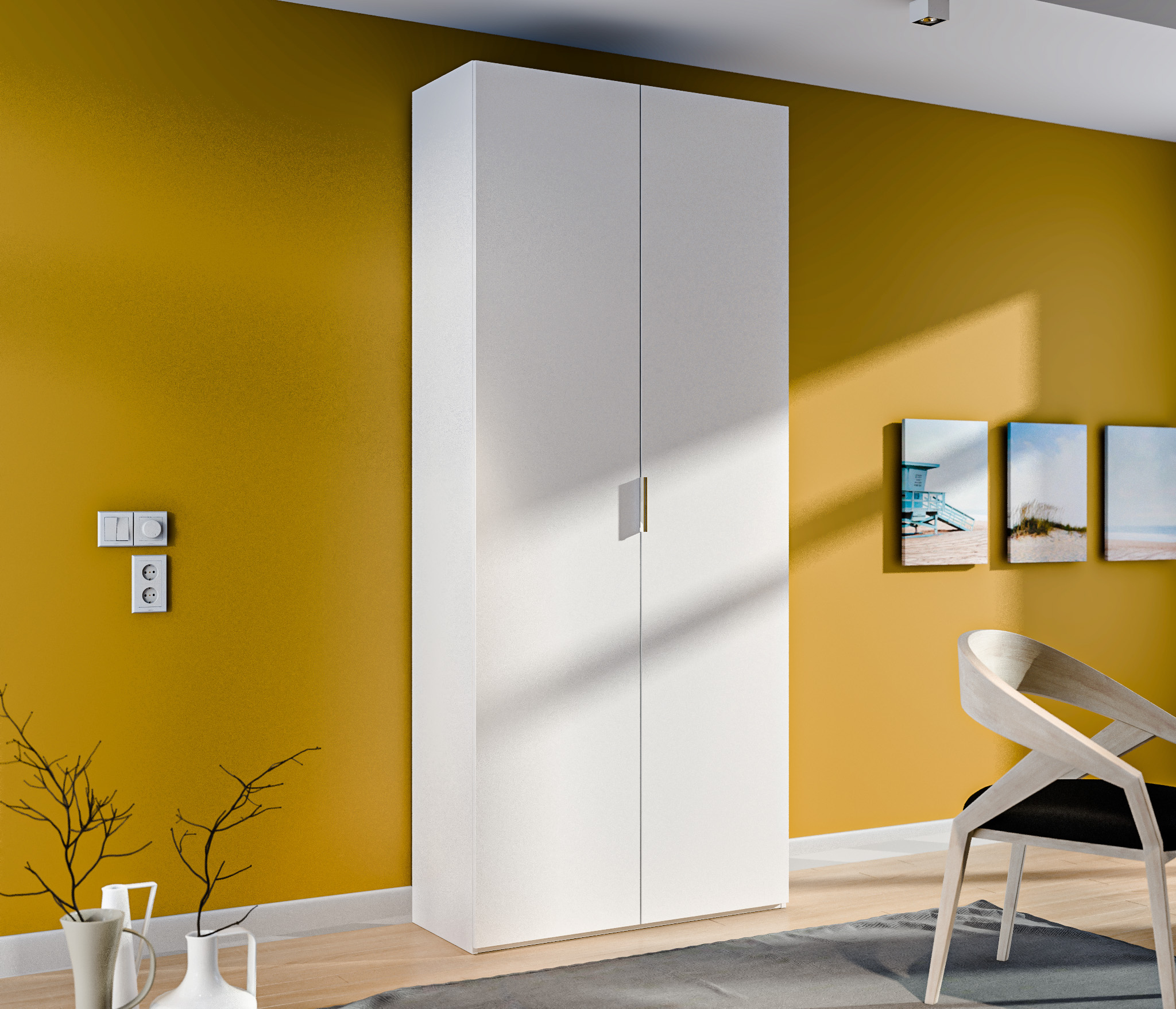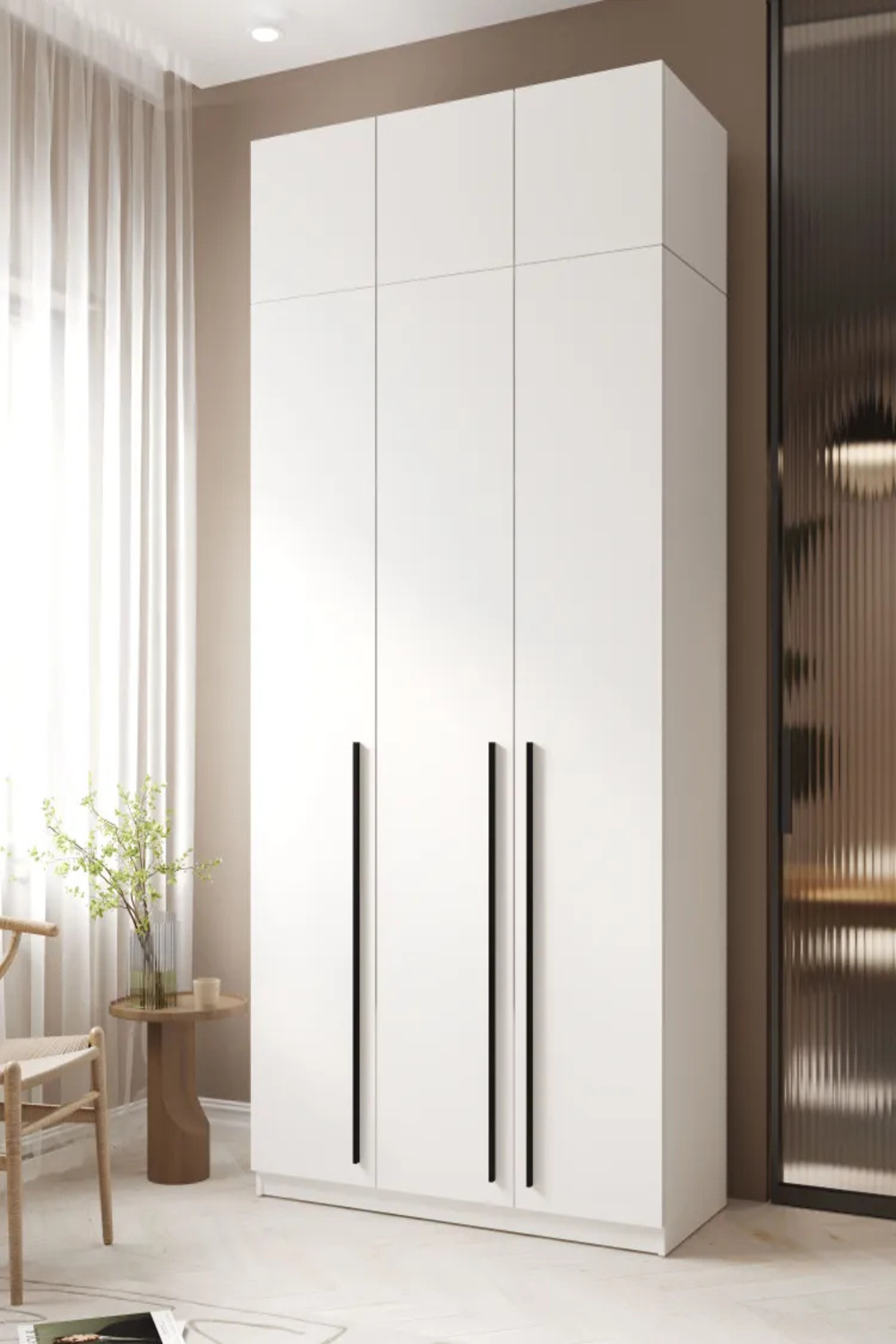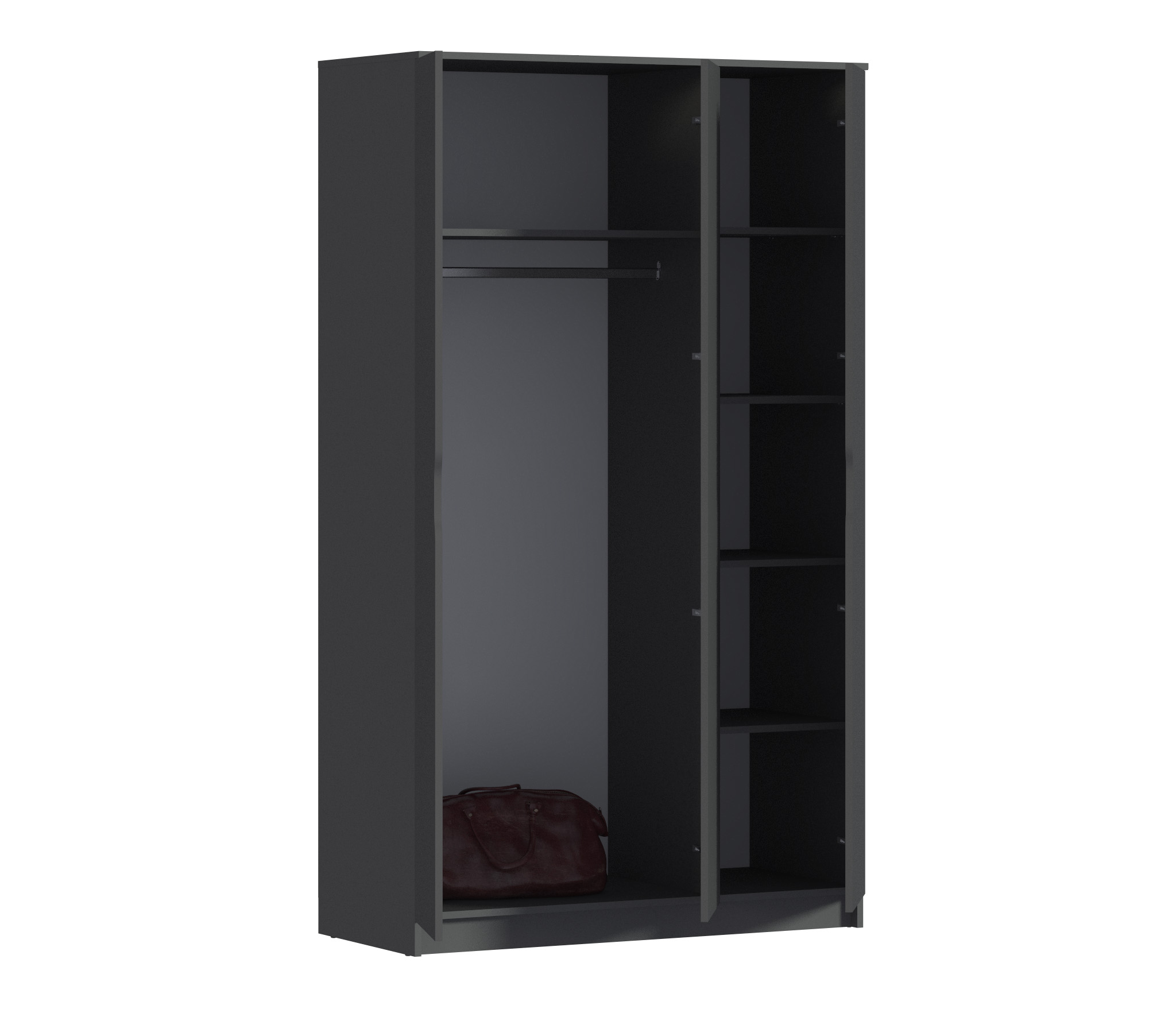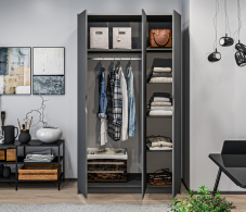 Шкаф имеет четыре полки и штангу для удобного хранения различных типов одежды. Шкаф не имеет ручек и обладает современным и минималистичным дизайном, который легко сочетается с различными интерьерами.