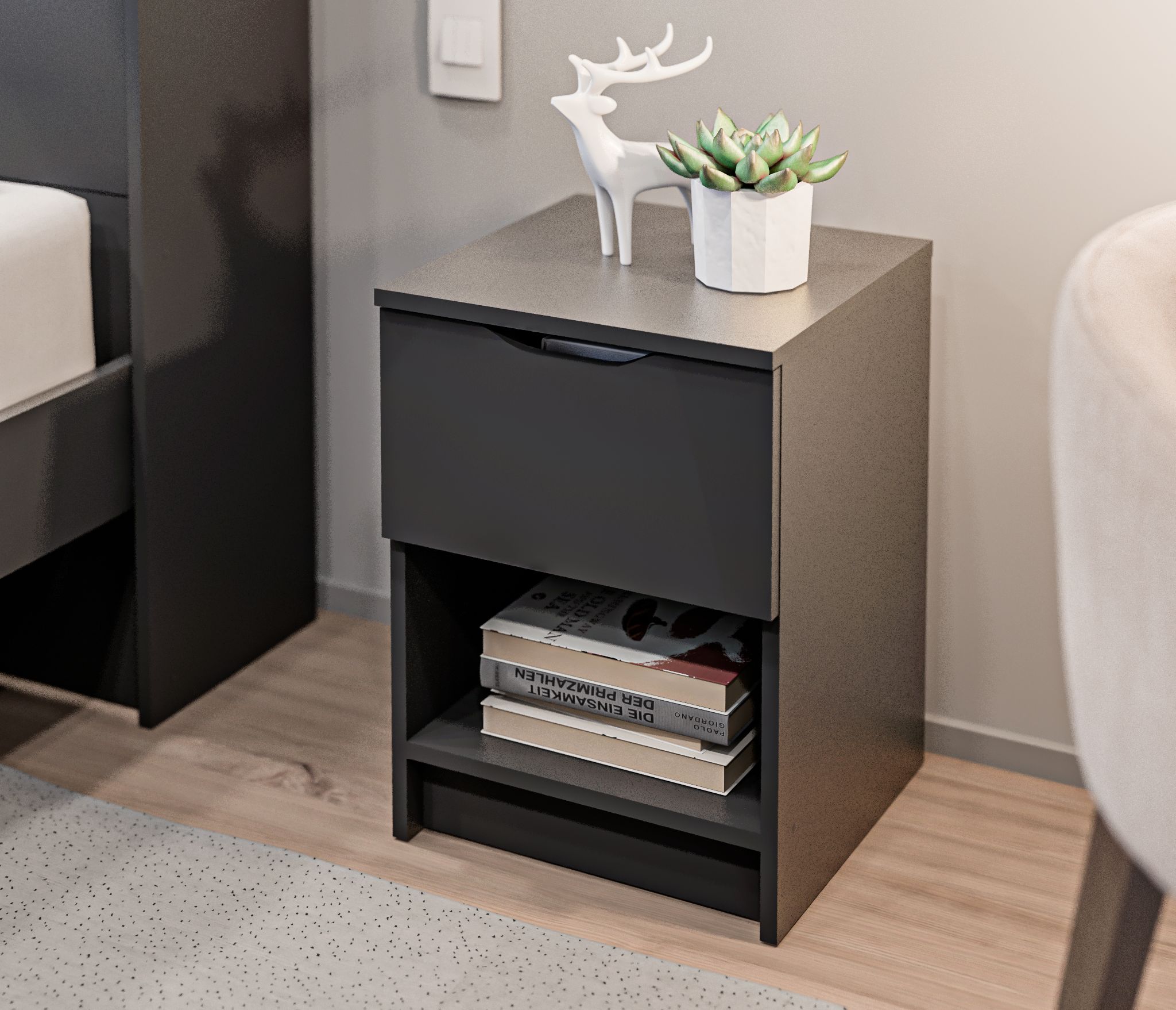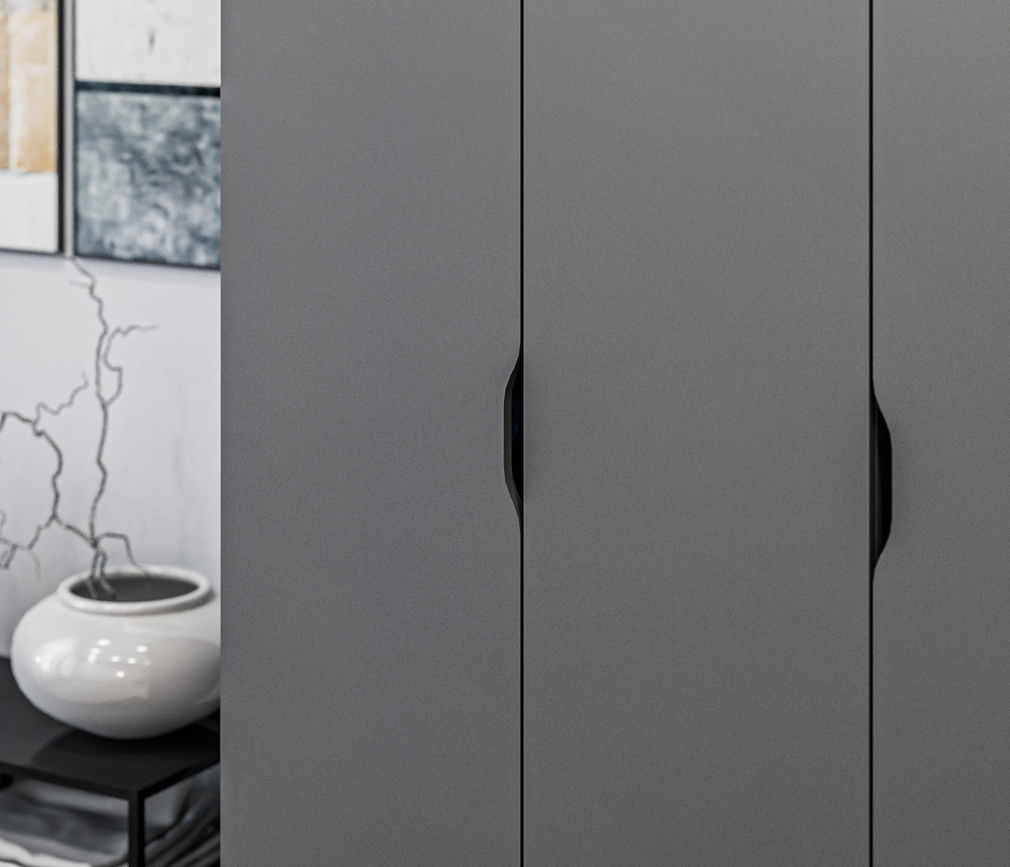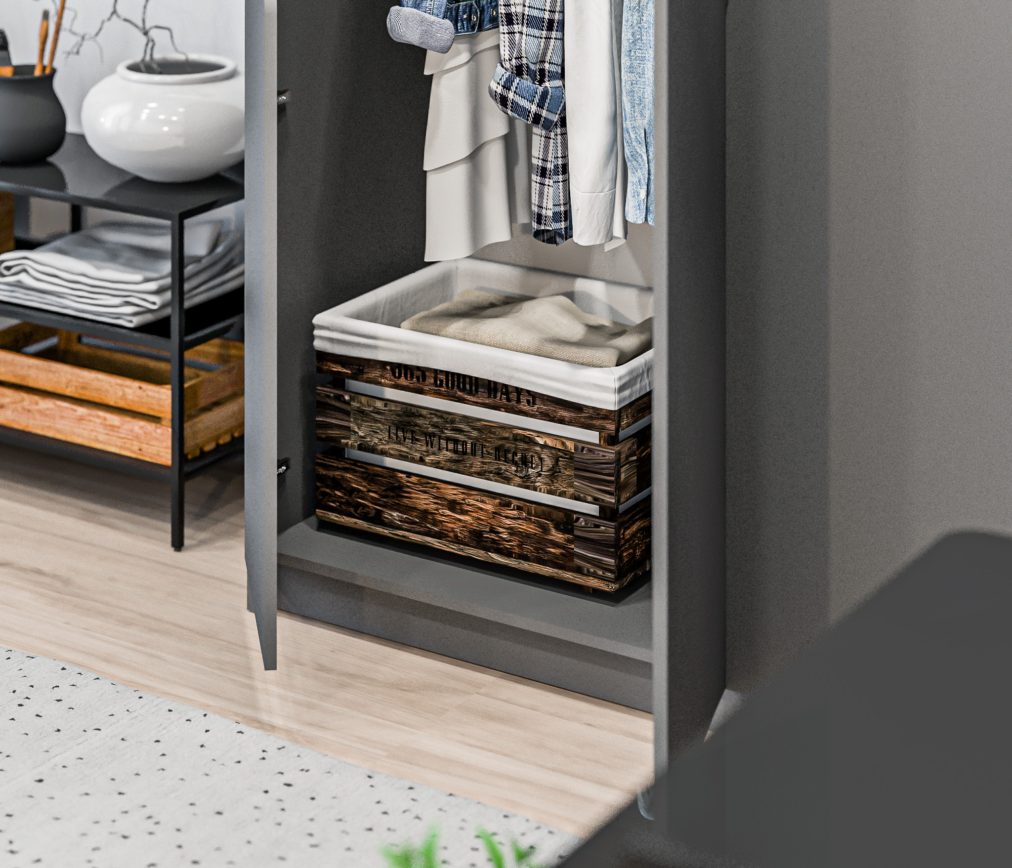 Шкаф имеет четыре полки и штангу для удобного хранения различных типов одежды. Шкаф не имеет ручек и обладает современным и минималистичным дизайном, который легко сочетается с различными интерьерами.
