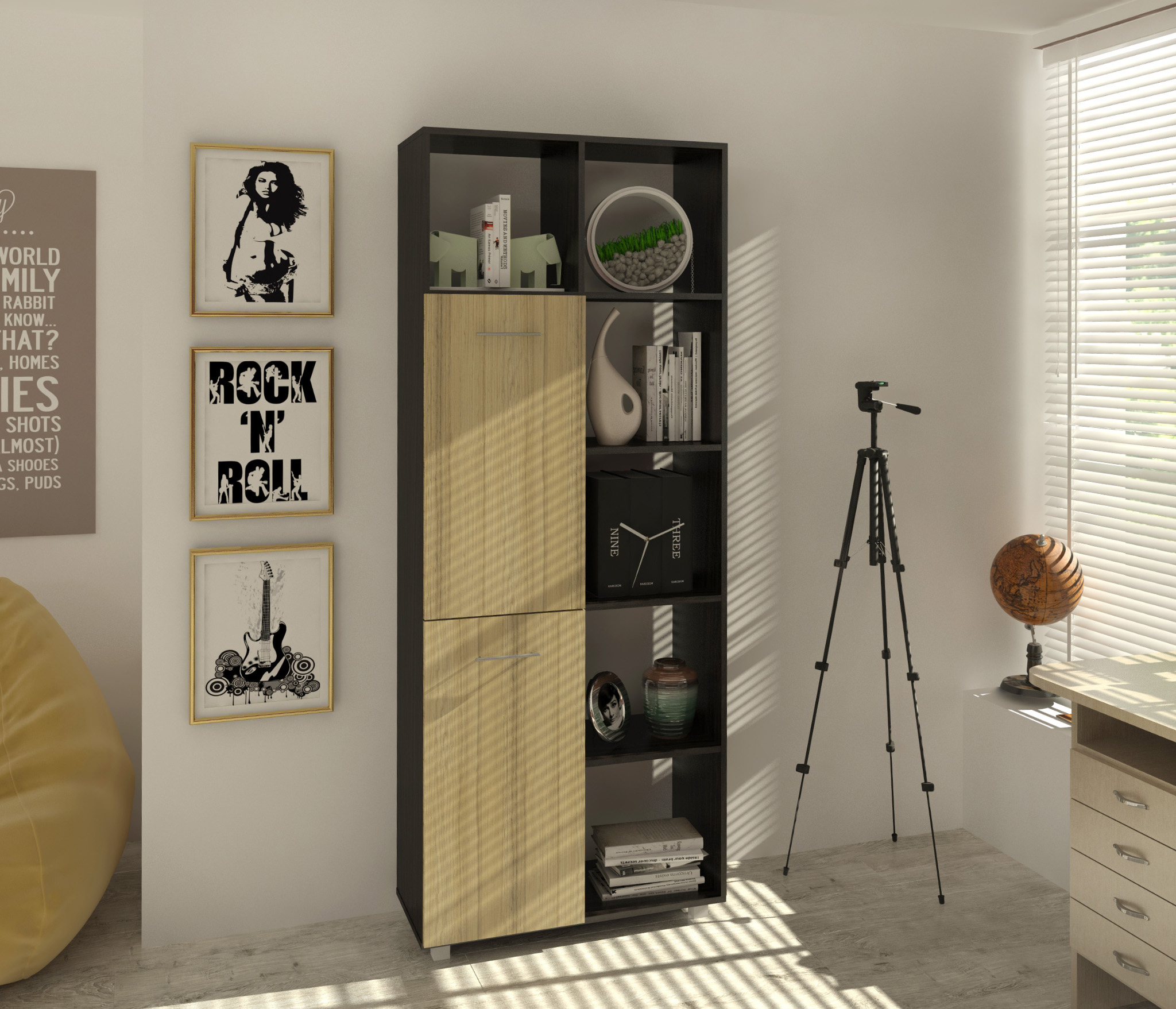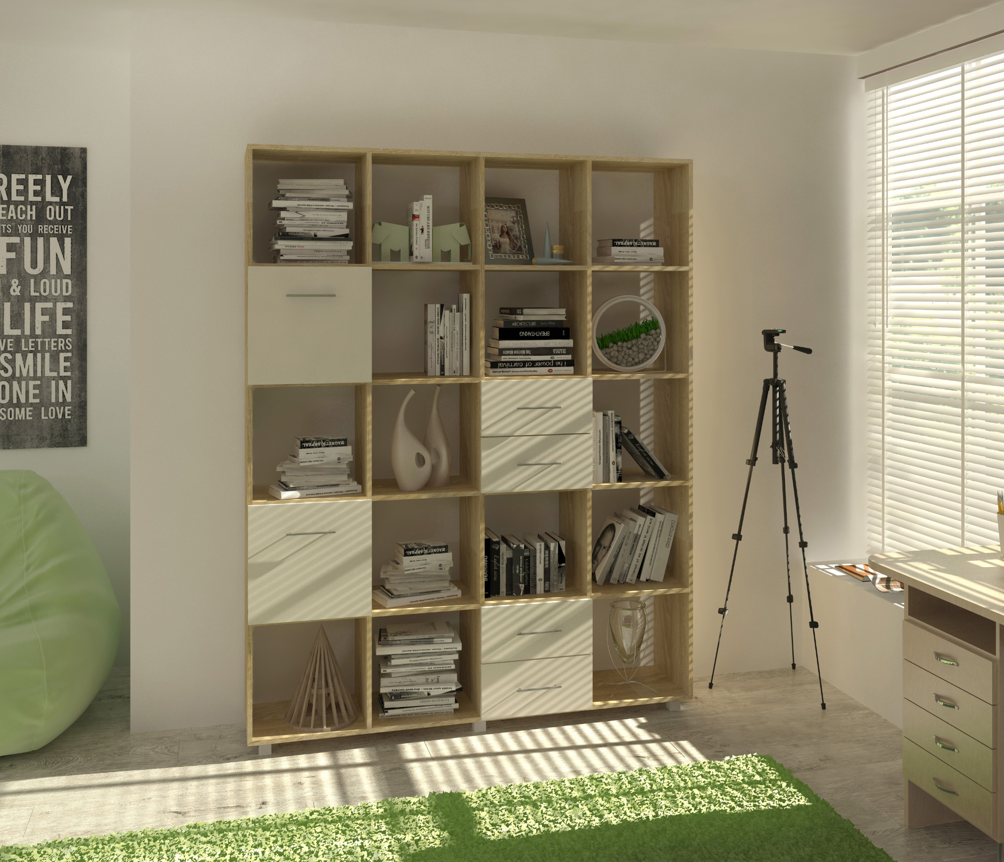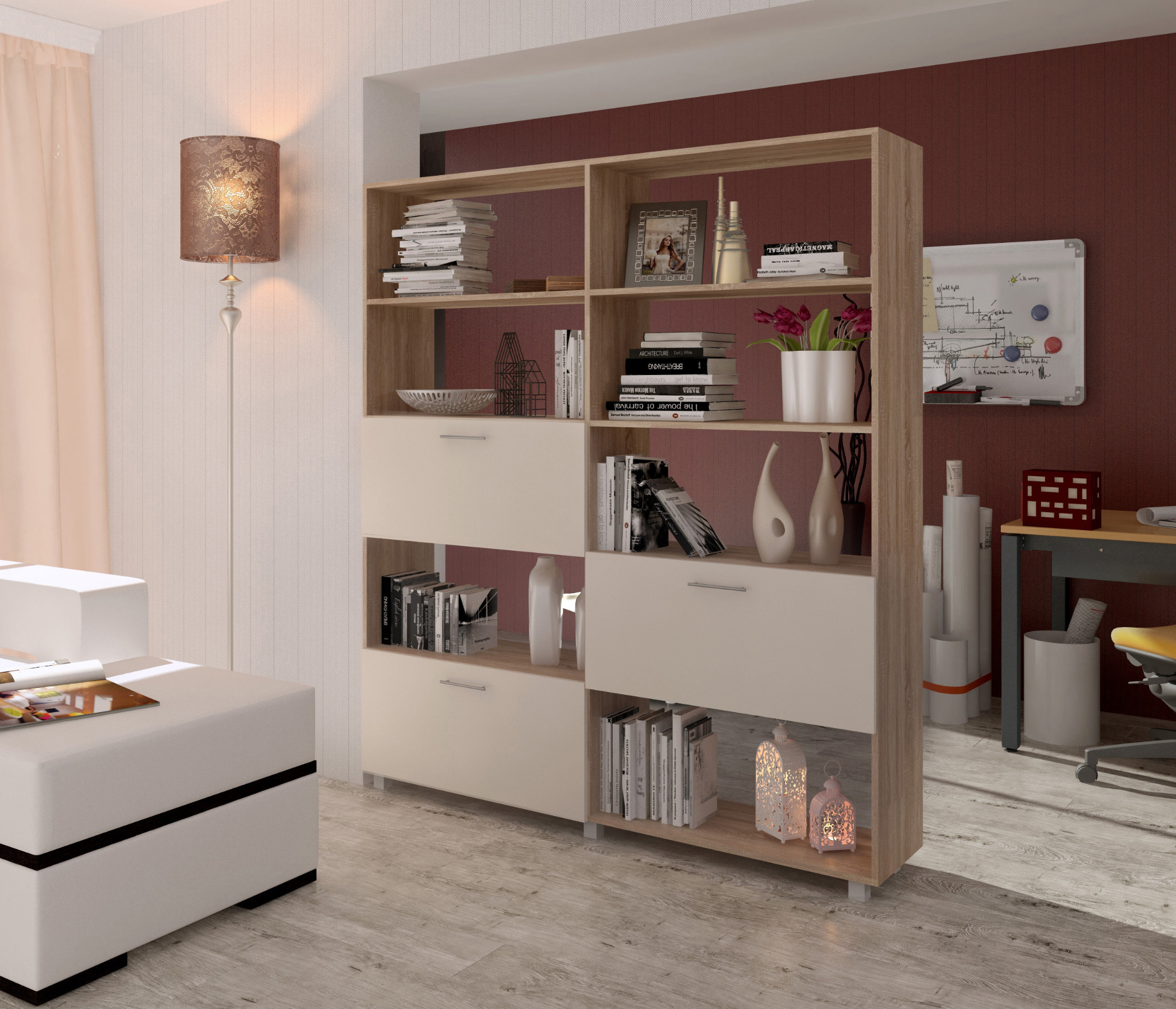 Устойчивый стеллаж с четырьмя полками с возможность доступа с любой стороны. Металлические стойки с регулируемыми опорами делают этот стеллаж надёжным, аутентичнымй и функциональным. Использование крестовых металлических стяжек вместо задней стенки делает конструкцию лёгкой, воздушной и устойчивой к боковым нагрузкам. Брутальный декор и контрастная кромка придаёт мебели индустриальную эстетику. Выполнена мебель из ламинированной ДСП 16 мм, торцы окромлены ПХВ плёнкой 0,4 мм и металлических стоевых. В производстве мебели использована современная фурнитура, отличающаяся высокой надёжностью и долговечностью. Поставляется в разобранном виде в надёжной упаковке, с комплектом сборочной фурнитуры и инструкцией по сборке.