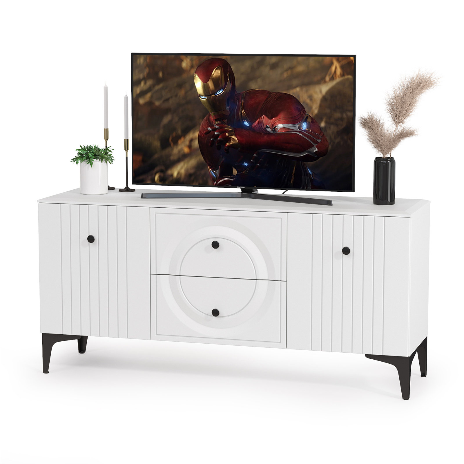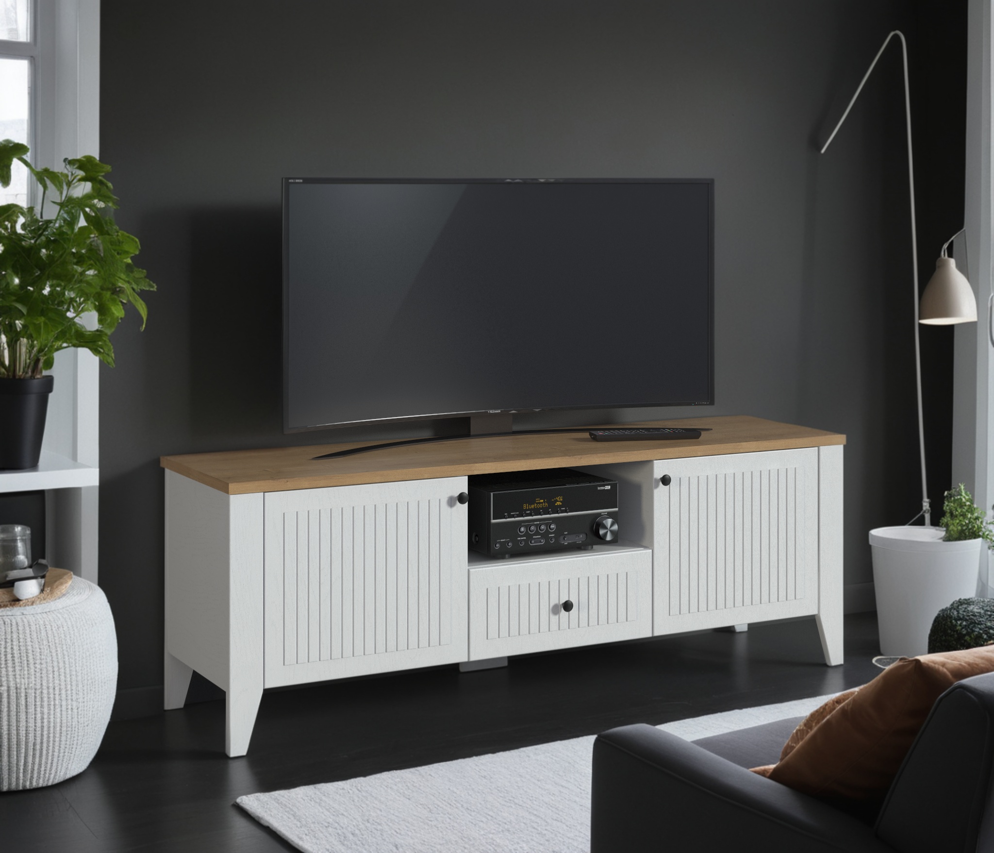 Тумба состоит из двух открытых ниш по бокам и ящика и закрытой нишей по центру. Все ниши имеет полочку по середине. На тумбе достаточно места для размещения телевизора дигональю 47 дюймов. Можно использовать как ТВ тумбу, так и обычную для хранения и размещения Ваших вещей. Продуманная конструкция позволяет убрать лишние предметы, тем самым сохраняя единый стиль оформления помещения. Отсутствие ручек главное преимущество данной модели. Роль ручек выполняют сами фасады. Открывание ящика и двери производится за счет пространства между планками и фасадами.