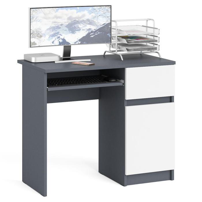Аккуратный стол компьютерный с тумбой и выдвижной панелью для клавиатуры. Тумба имеет нишу с полочкой за распашной дверкой и выдвижной ящик на роликовых направляющих. Стол компьютерный Мори МС-1 правый не имеет универсальной сборки - выдвижной ящик расположен справа. Продуманная конструкция позволяет убрать лишние предметы, тем самым сохраняя единый стиль оформления помещения. Отсутствие ручек главное преимущество данной модели. Роль ручек выполняют сами фасады. Открывание ящиков и дверки производится за счет пространства между планками и фасадами. Выдвижной ящик на роликовых направляющих L=350 мм. неполного выдвижения обеспечивают комфортную эксплуатацию. На нижних кромках опор предусмотрены пластиковые подпятники для защиты поверхности пола от механических повреждений.