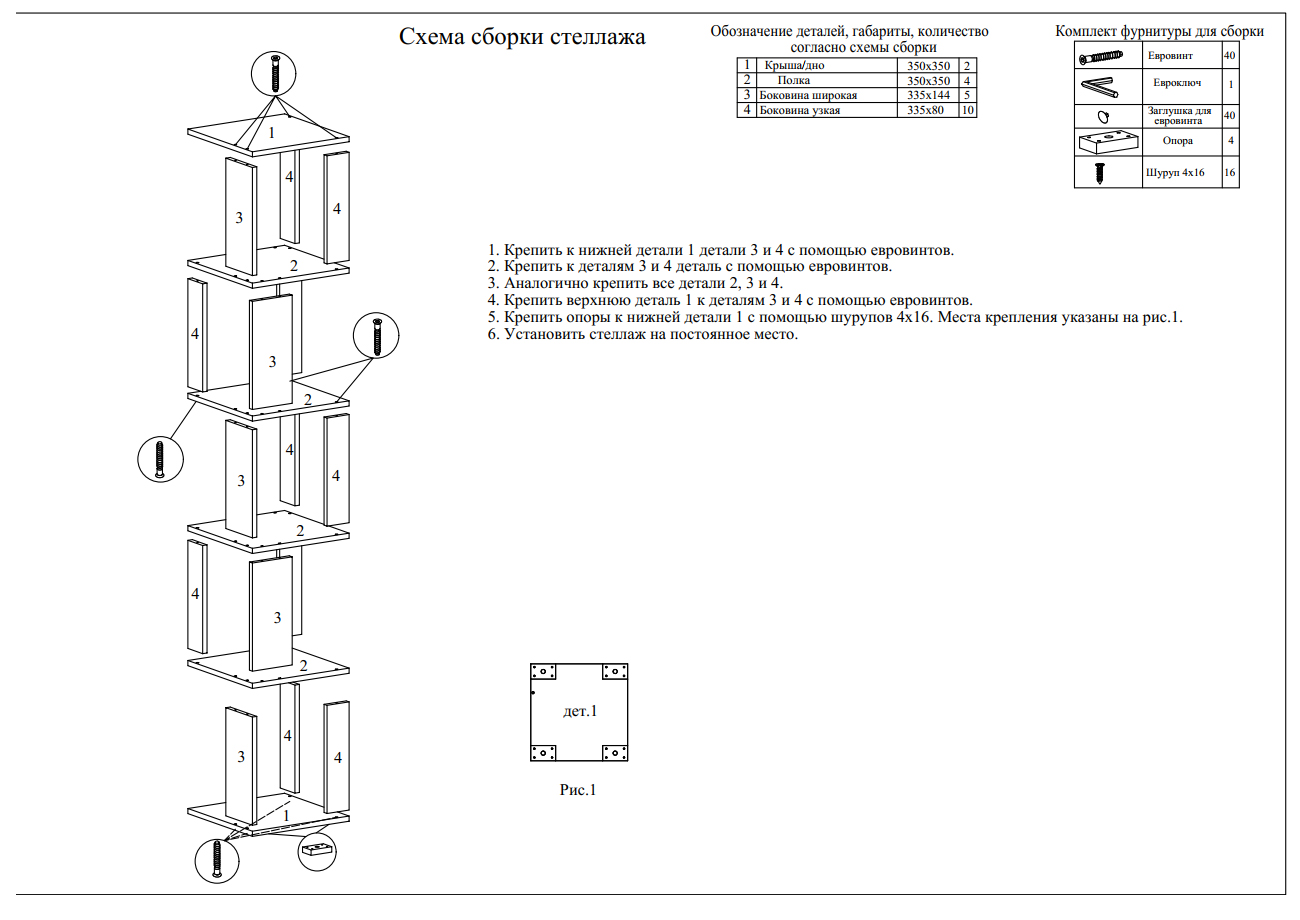 Выполнен комплект их 2-х стеллажей из прочной ламинированной ДСП 16 мм, торцы деталей закромлены плёнкой ПВХ 0,4-2 мм. Поставляется в разобранном виде, надёжно упакованной в гофрокартон, с приложенной подробной инструкцией по сборке.