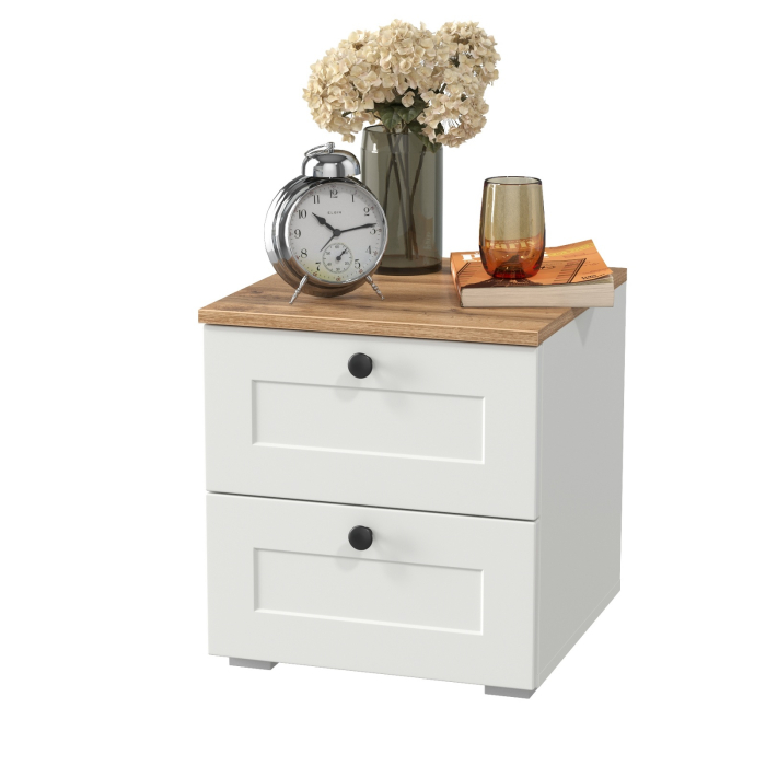 Тумба прикроватная с двумя выдвижными ящиками для хранения различных принадлежностей и мелких предметов. Скрытые направляющие выдвижных ящиков предназначены для обеспечения мягкого и плавного закрывания. Эти направляющие интегрированы таким образом, что они незаметны с внешней стороны, обеспечивая эстетичный внешний вид и комфортное использование мебели. Тумба оснащена регулируемыми опорами, выполненными из серого пластика.